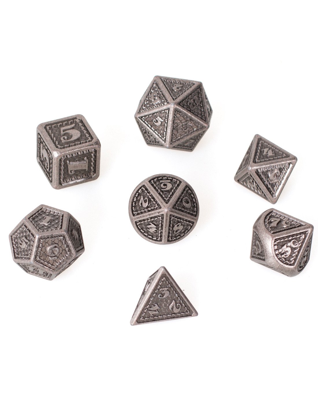 Découvrez le Lot 7 dés métal 16mm - Dragon Scale Silver , un set élégant et durable pour tous vos jeux de rôle.