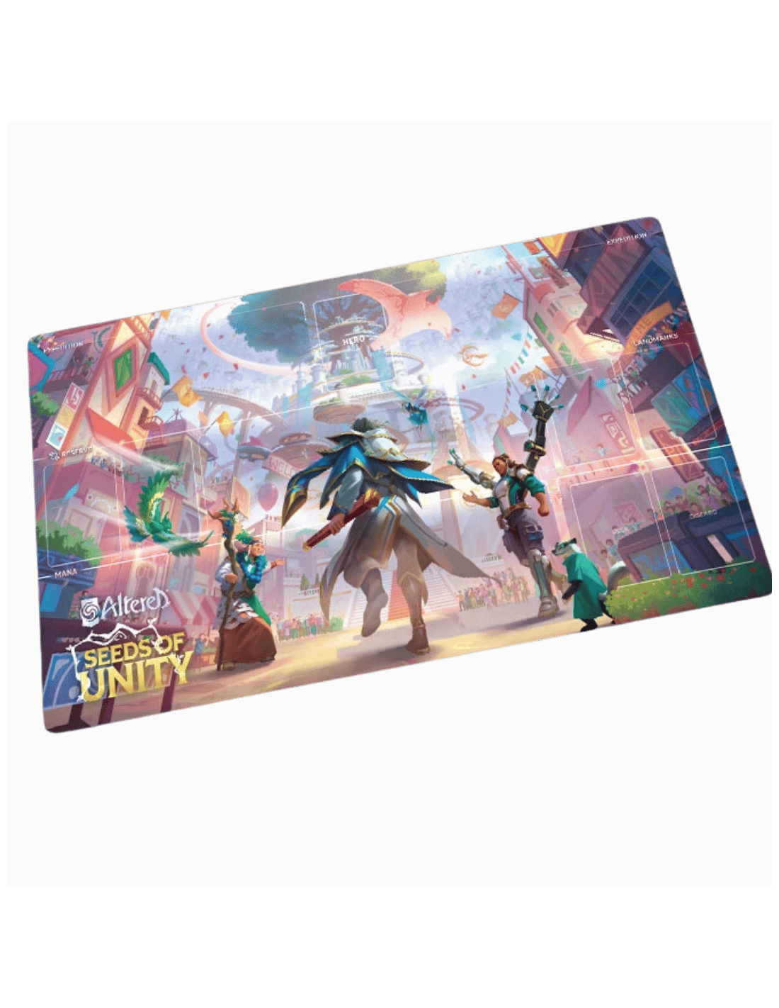 Découvrez un accessoire officiel Altered, à la fois élégant et immersif, célébrant le cinquième set du jeu : Seeds of Unity. Ce tapis met en scène la rencontre entre Reka et Asgarthi autour du majestueux Naos, l’Arbre-Monde d’Asty.