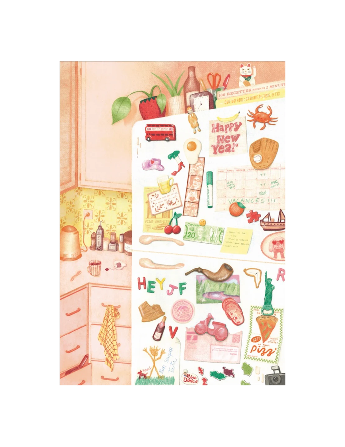 Cette scène détaillée évoque la vie de tous les jours : dessins d’enfants, cartes postales, magnets de vacances, recettes et petits mots doux collés sur la porte du réfrigérateur. Chaque pièce assemble une mosaïque de moments heureux, simples et sincères.