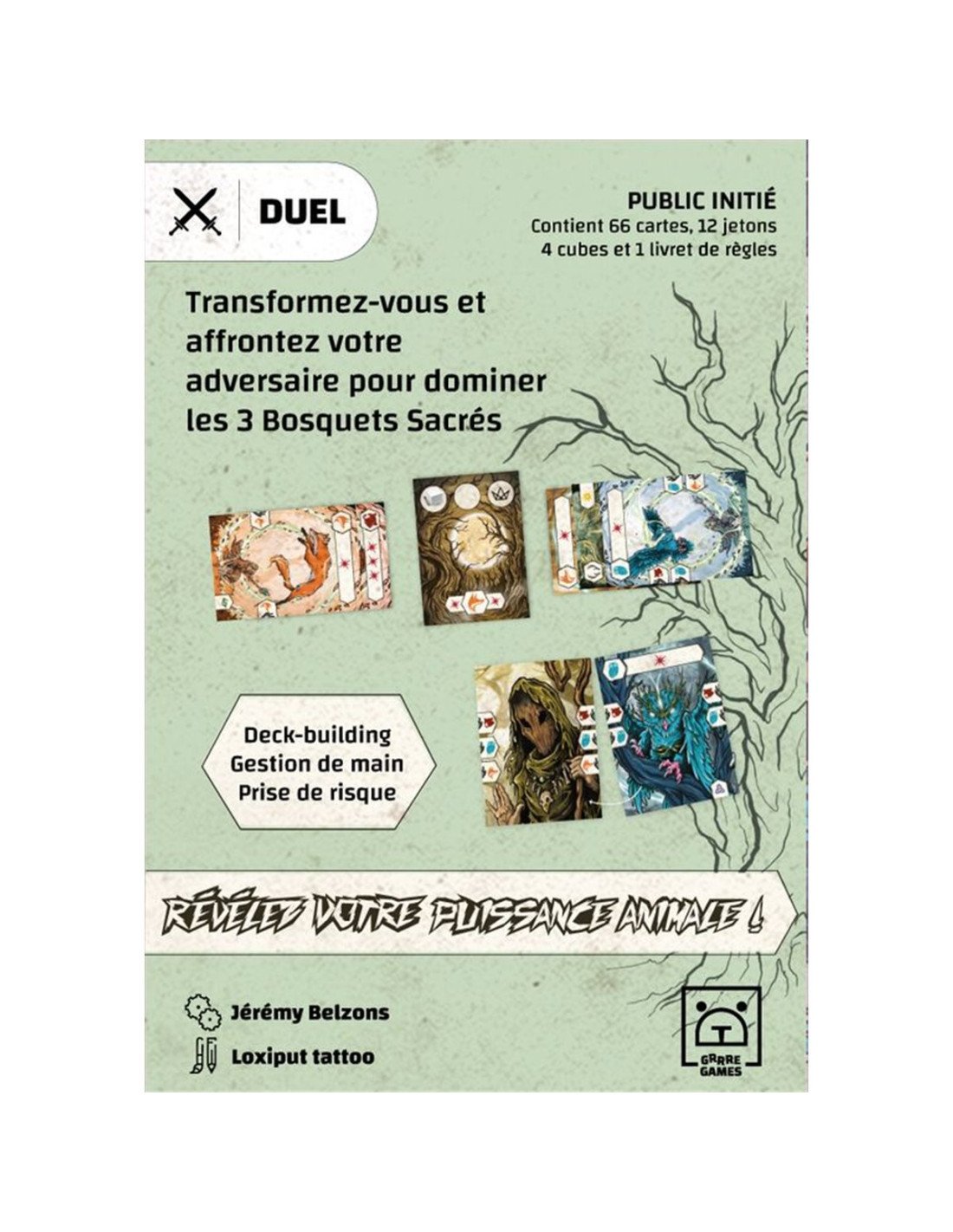Bloody Grove est un jeu captivant pour 2 joueurs, où la stratégie et la métamorphose sont au cœur de l'action. Dans ce jeu de deck-building, vous devez accumuler plus de points de Domination que votre adversaire après 4 manches, ou contrôler les 3 Bosquets à la fin d'une manche pour remporter instantanément la partie. Chaque tour, vous aurez le choix entre envoyer un esprit animal sur un bosquet ou vous transformer pour récupérer des esprits plus puissants, améliorant ainsi votre paquet de cartes ou votre main.
