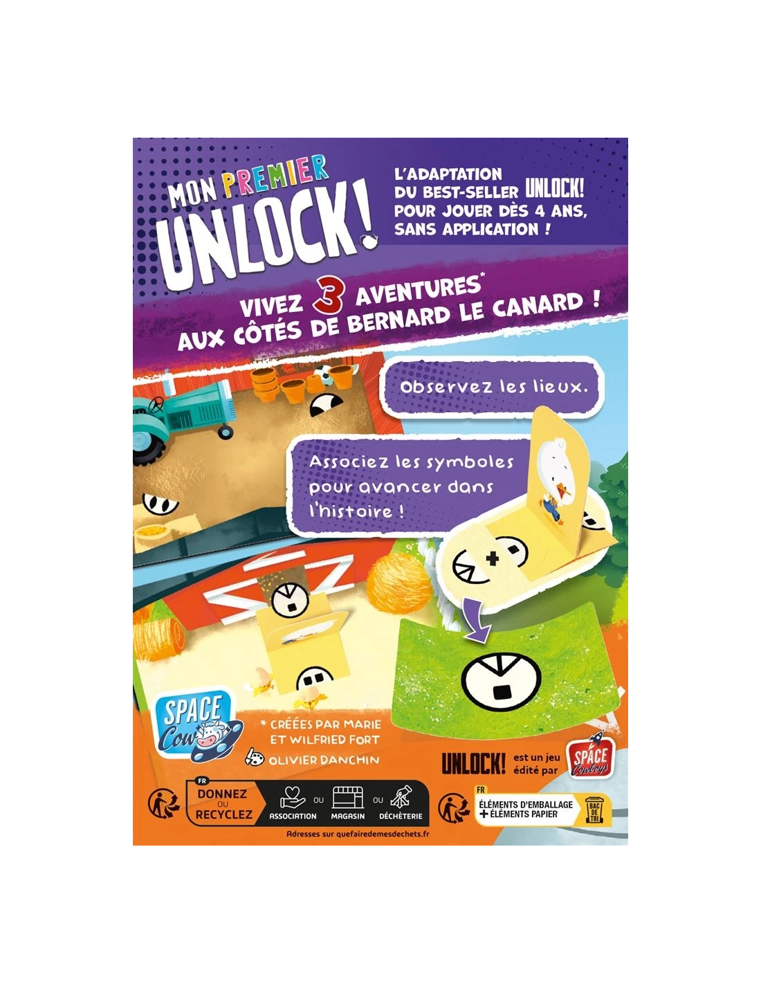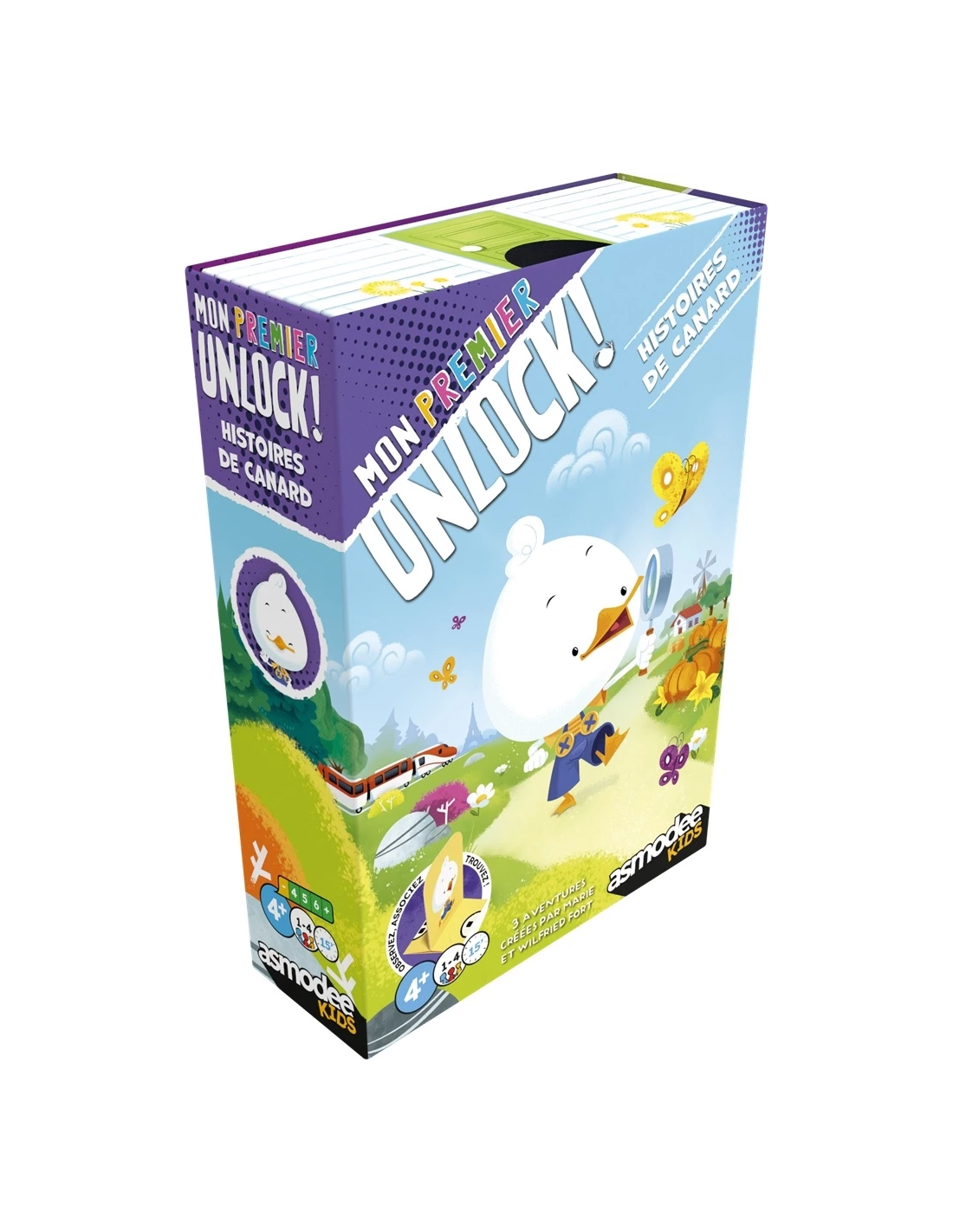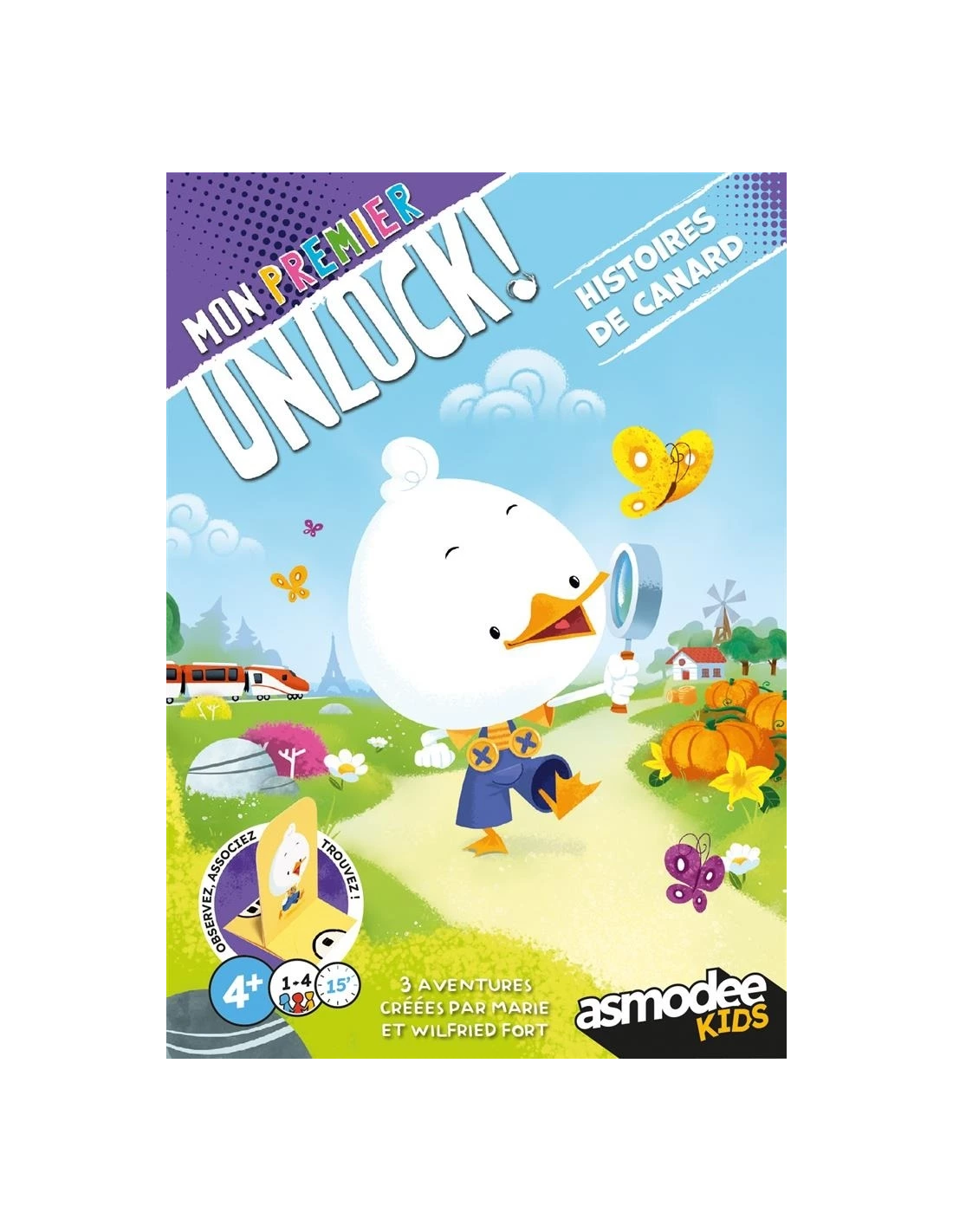 Avec Mon Premier Unlock! : Histoires de Canard, les enfants découvrent le plaisir des enquêtes et des énigmes adaptées à leur âge. Sans texte et sans application, ce jeu coopératif invite petits et grands à accompagner Bernard le Canard à travers 3 aventures pleines de couleurs et de surprises.