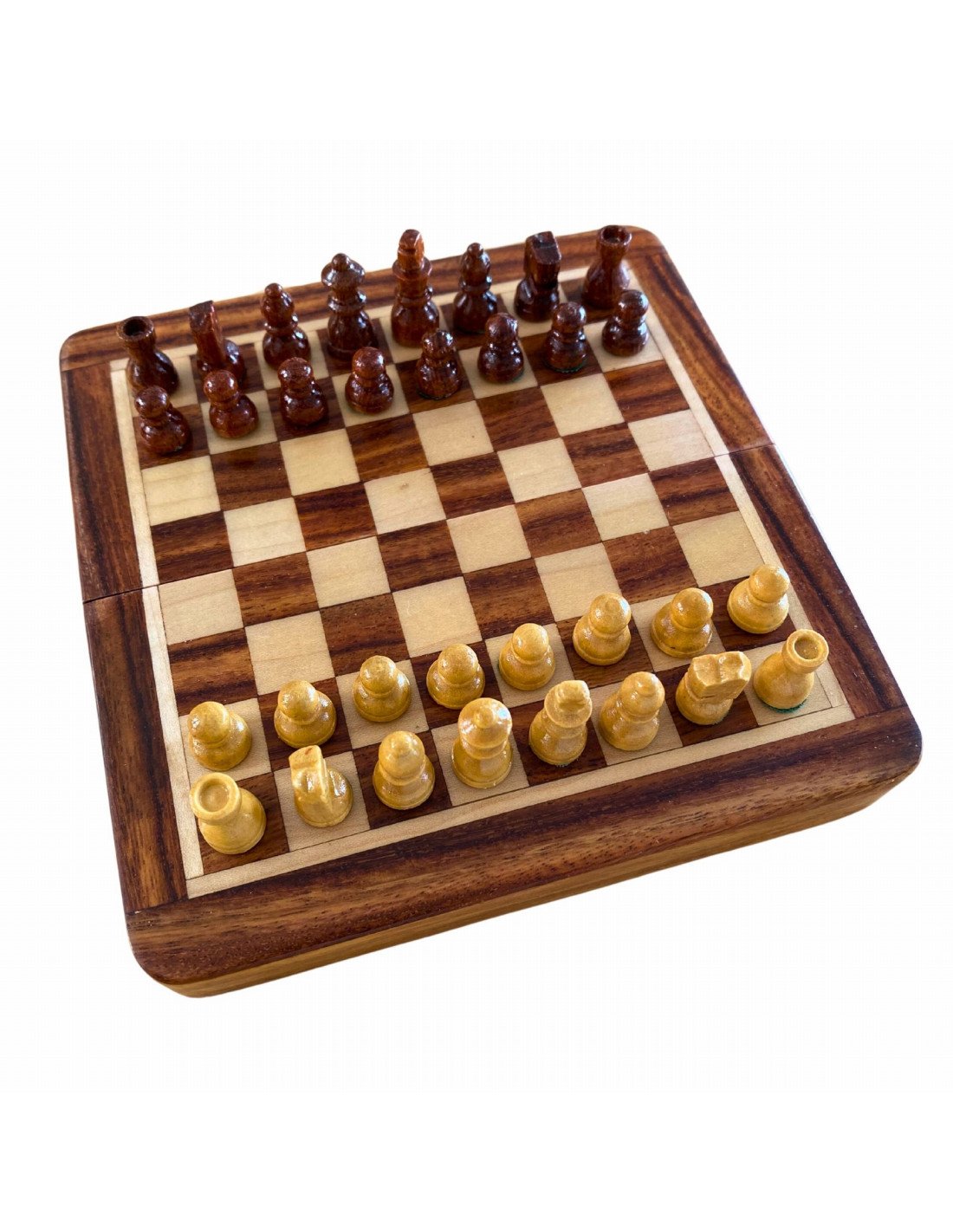 L'Echiquier Pliant 13cm Roi 19mm est parfait pour jouer aux échecs en voyage, avec ses pièces magnétiques et son rangement sécurisé.