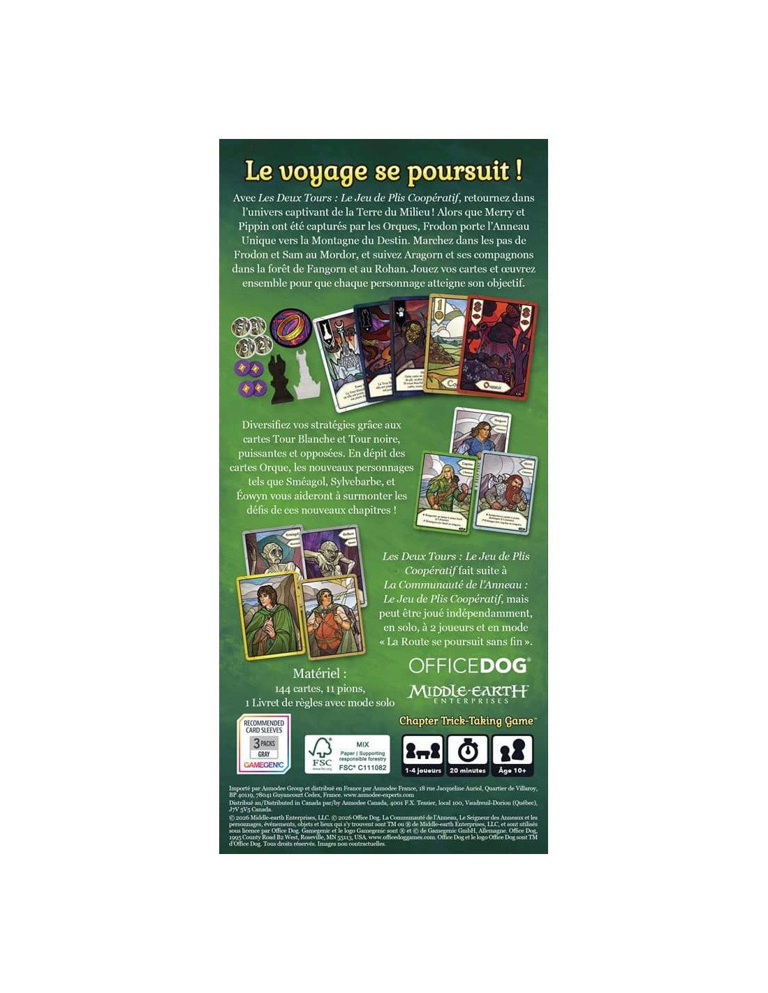 Plongé dans l’univers du Le Seigneur des Anneaux et plus précisément de l’arc narratif des Deux Tours, ce jeu met les joueurs dans la peau de héros qui doivent accomplir ensemble une succession de chapitres aux règles évolutives. Chaque partie se joue en équipe, dans laquelle chacun joue des cartes de sa main tout en s’appuyant sur les autres pour réussir des objectifs communs : gérer des menaces orques, franchir des étapes clés, coopérer sans jouer chacun uniquement pour soi. Le jeu propose également des modes solo, à deux joueurs, ou un mode « La Route se poursuit sans fin ». Avec 144 cartes, 6 pions et un livret de règles, la boîte propose une expérience accessible tout en gardant du défi grâce aux conditions spécifiques de chaque scénario. L’univers narratif de Tolkien s’invite jusque dans les mécaniques : temporalité éclatée, choix stratégiques, coordination subtile. Chaque nouveau chapitre change les conditions, les personnages jouables et les défis à relever — ce qui assure une vraie rejouabilité et une montée en tension progressive.