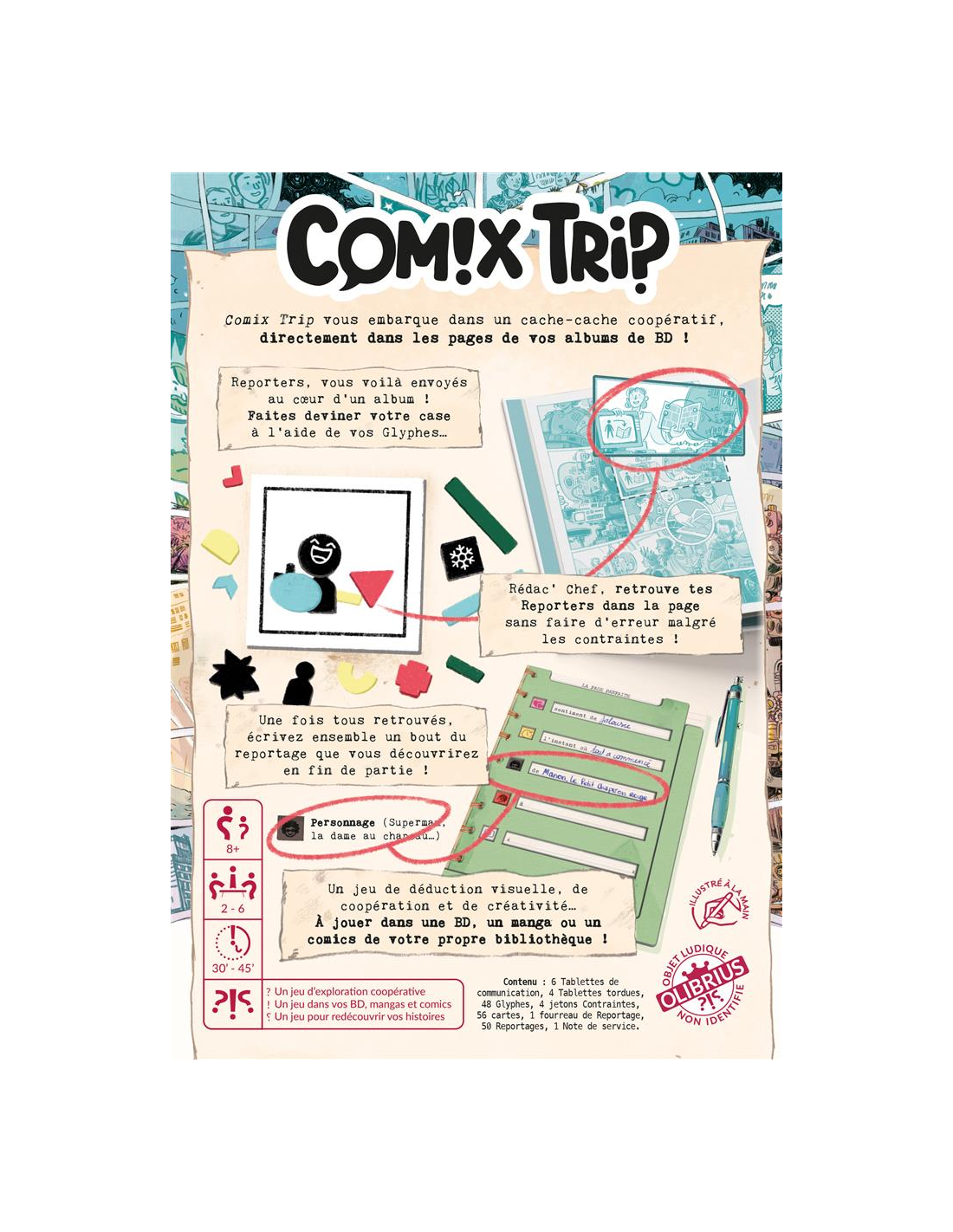 Dans Comix Trip, chaque partie vous plonge au cœur de vos albums de bande dessinée préférés. À partir d’une planche choisie, chaque joueur doit faire deviner une case précise à ses coéquipiers grâce à ses pions Glyphe. Mais attention : les glyphes sont limités et la communication restreinte.