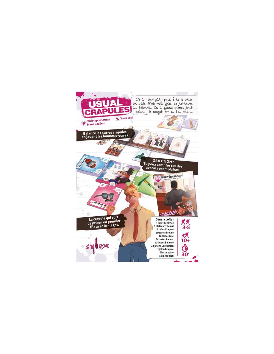 Usual Crapules est un jeu d’ambiance accessible dès 10 ans, qui mélange habilement bluff, combos de cartes et interactions délicieusement perfides. Dans ce jeu, chaque carte peut être preuve, juré, avocat ou objection, ce qui ajoute une dimension stratégique et amusante à chaque partie. Préparez-vous à plonger dans un univers où la tromperie et la ruse sont de mise, et où chaque joueur doit faire preuve de finesse pour gagner.