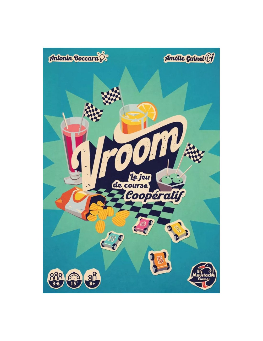 Vroom est un jeu de cartes coopératif pour 3 à 6 joueurs. Dans ce jeu de course, les joueurs doivent coordonner les déplacements de leurs véhicules sans jamais révéler leur vitesse. Ici, pas de plateau : la table devient le circuit ! Poussez vos petites voitures en bois et estimez la distance parcourue afin de franchir la ligne d’arrivée dans le bon ordre et remporter, tous ensemble, la course.