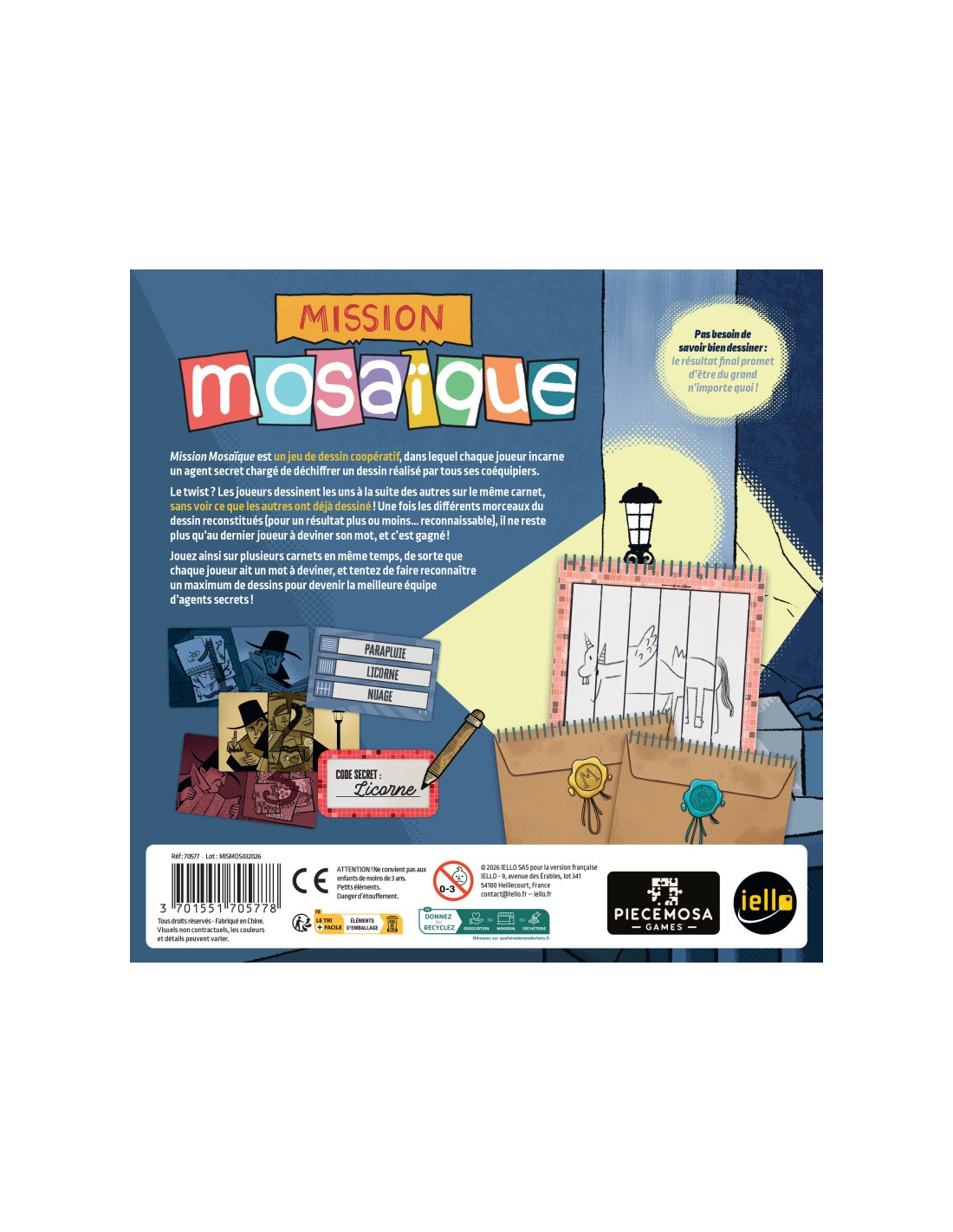 Mission Mosaïque est un jeu d'ambiance captivant qui vous plonge dans une expérience de dessin collaboratif. Réunissez de 4 à 8 joueurs et préparez-vous à relever le défi de dessiner des éléments d'un code secret en un temps record de 10 secondes. Passer le carnet à votre voisin et assembler les fragments pour deviner le mot final est la clé pour réussir votre mission ensemble !