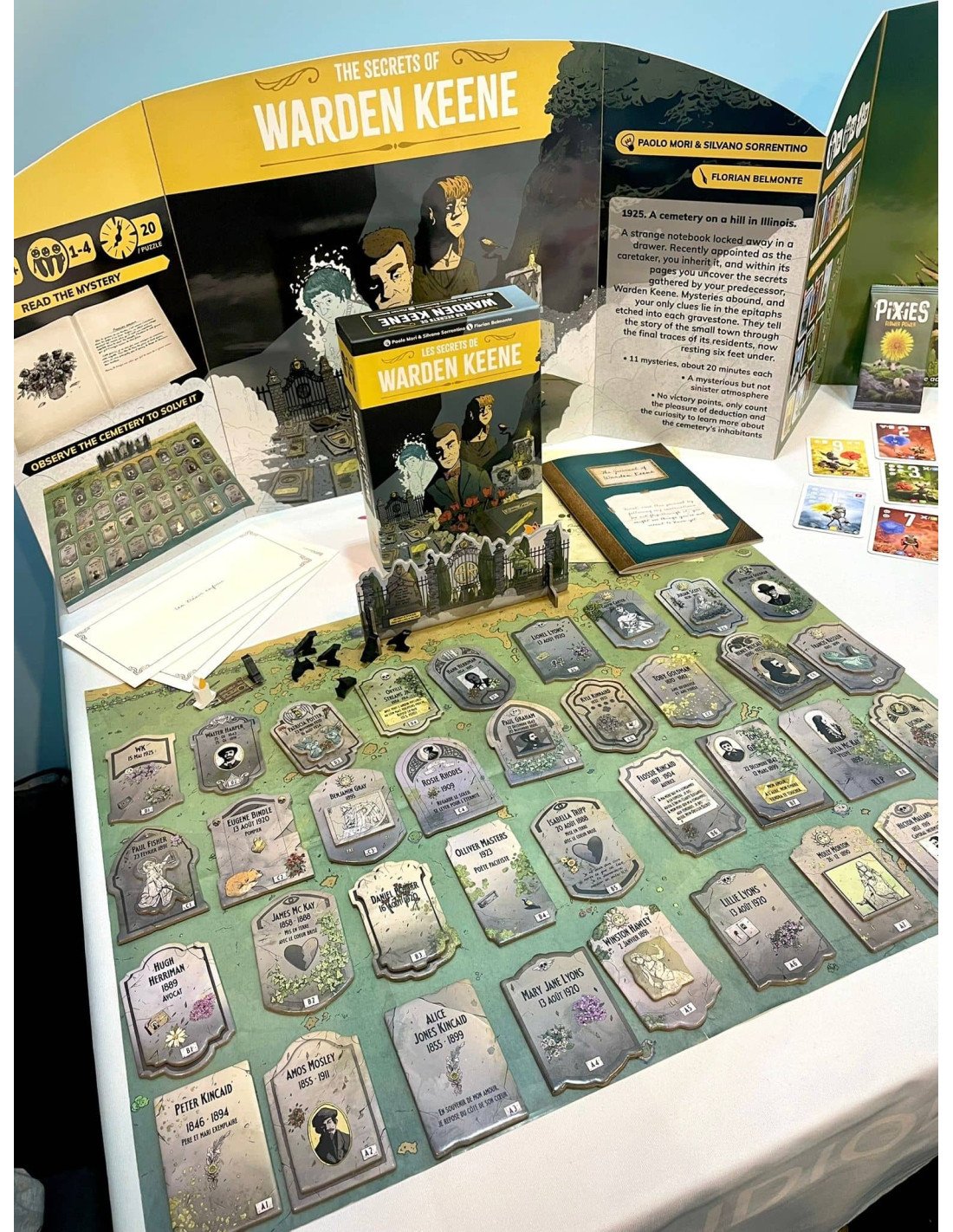 Un ancien cimetière sur une colline de l’Illinois, celui du gardien Warden Keene. Vous êtes le nouveau gardien. En fouillant la loge de votre prédécesseur, vous découvrez son carnet rempli de notes, et un étonnant univers d’épitaphes vous attend. Dans Les Secrets de Warden Keene, chaque joueur ou équipe scrute les pierres tombales, les épitaphes, les dates, les motifs, les noms inscrits. Chaque enquête est une invitation à l’observation fine et à la déduction délicate : quel lien relie ces tombes ? Quelle histoire se révèle ?