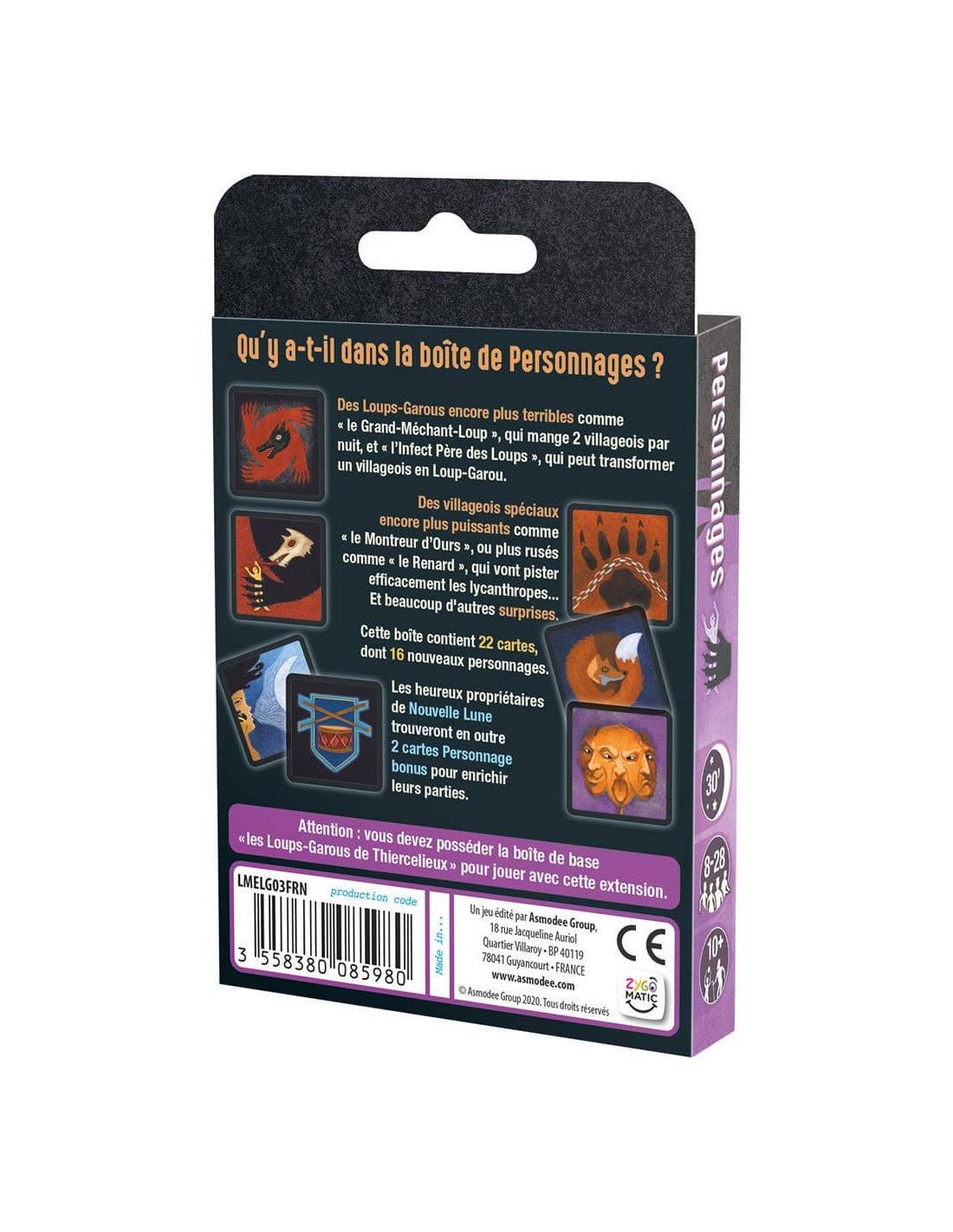 L’extension Personnages pour le jeu culte Les Loups‑Garous de Thiercelieux vous invite à découvrir 16 nouveaux rôles aux pouvoirs uniques qui vont bouleverser la dynamique de vos soirées. Enrichissant le jeu de base, cette extension nécessite la boîte principale pour fonctionner, mais vous propulse dans des débats encore plus intenses. Nuit après nuit, les rôles spéciaux s’activent et transforment les parties en véritables spectacles de bluff, déduction et surprise. Parfaite pour des groupes de 8 à 28 joueurs et dès 10 ans, cette boîte ajoute une profondeur stratégique tout en restant accessible et rapide (environ 30 minutes).