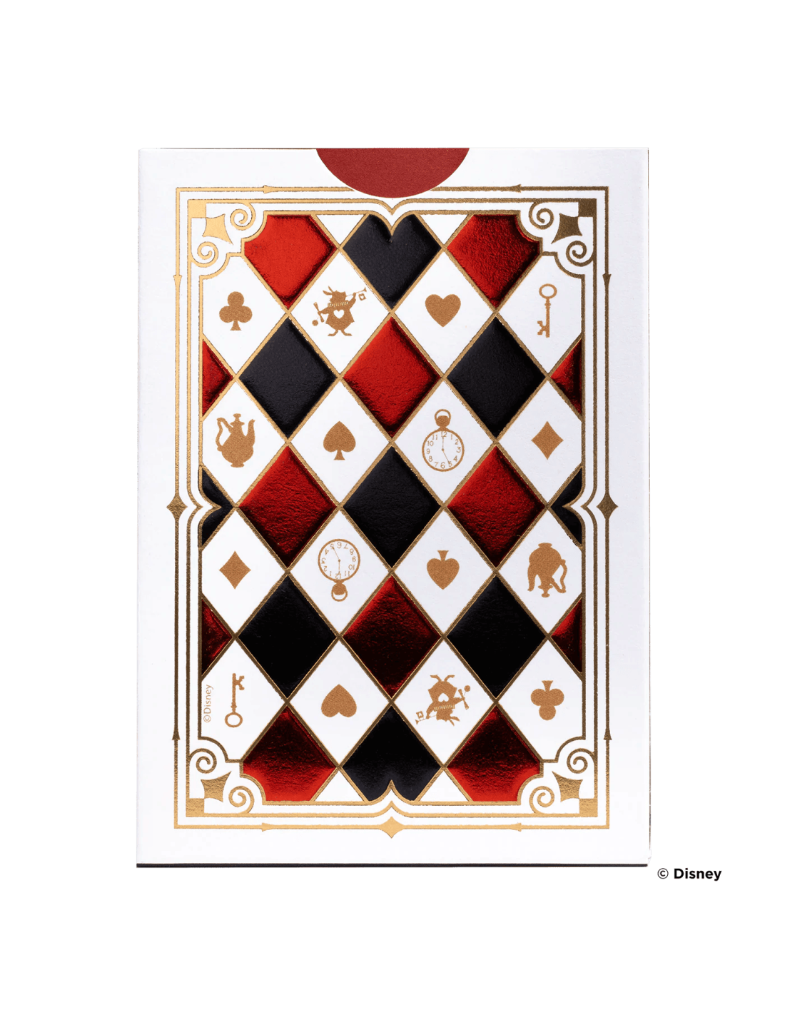 Découvrez les cartes à jouer Disney Alice au Pays des Merveilles créées par Bicycle ! Avec une boîte ornée de somptueux détails en rouge, noir et or, cette édition reflète toute la grandeur de la cour royale de la Reine de Cœur. Les cartes de cour, spécialement conçues, prennent vie avec des personnages emblématiques tels qu'Alice, le Chapelier Fou, et l'énigmatique Chat de Cheshire !