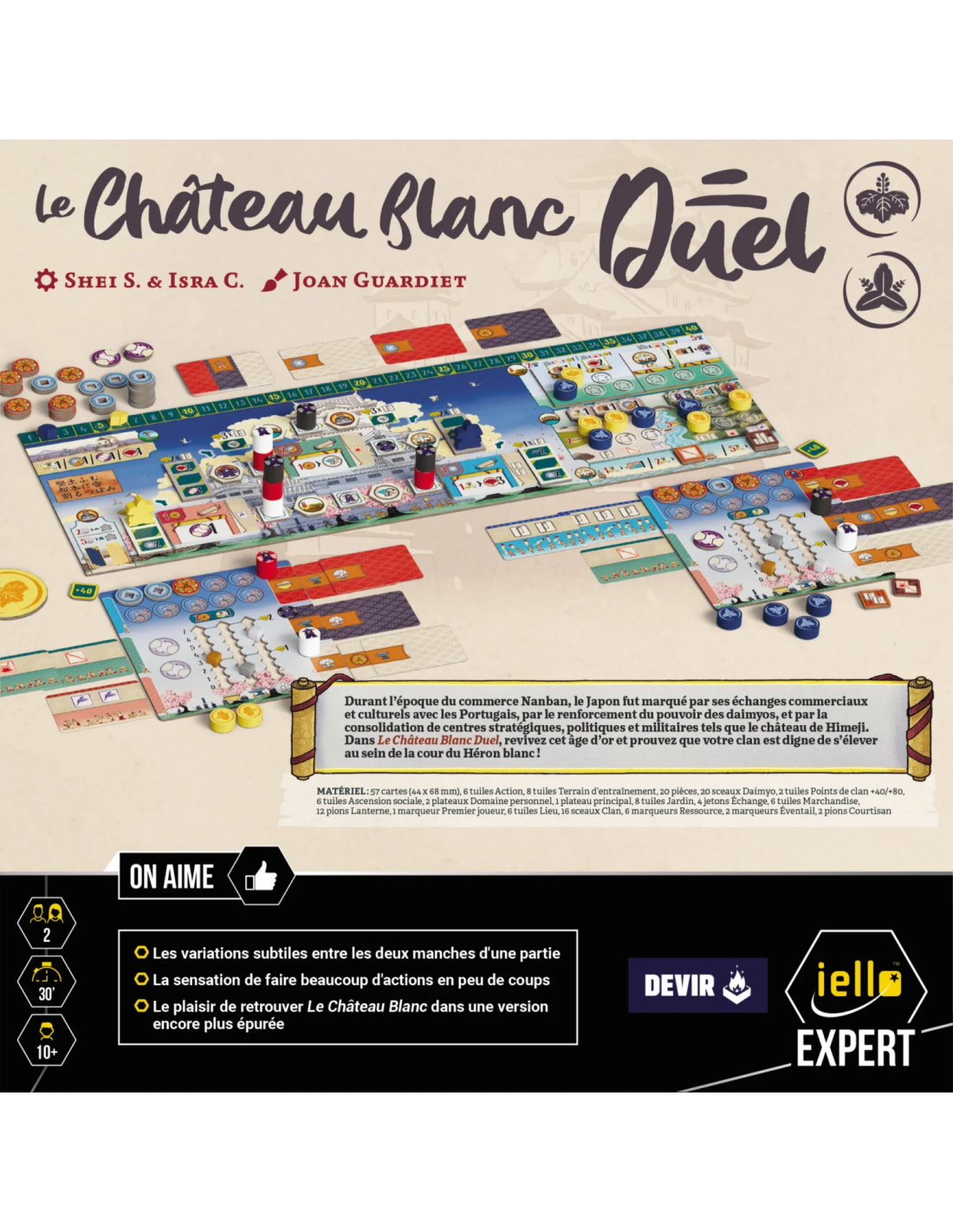 Après l’arrivée des Portugais au Japon, le château de Himeji devint un lieu stratégique où se jouaient pouvoir et prospérité. Dans Le Château Blanc – Duel, deux clans rivaux s’affrontent pour gagner en influence auprès de la cour, en exploitant les opportunités offertes par le commerce extérieur et les échanges culturels.