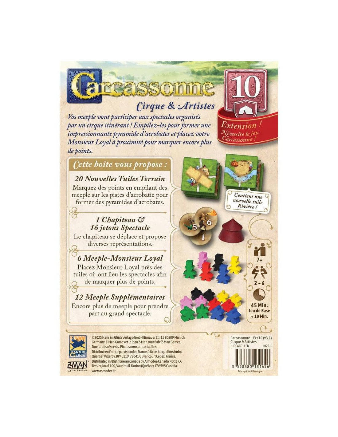 Créez des pyramides de meeples et suivez le chapiteau à travers Carcassonne ! Une extension pleine d’acrobaties et de tactiques spectaculaires !