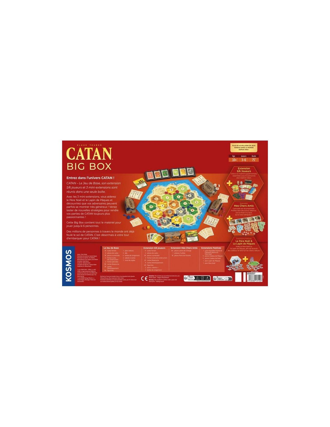 Plongez dans l'univers captivant de CATAN Big Box, un jeu de gestion qui vous invite à bâtir des routes, des villes et à échanger des ressources avec vos amis. Cette édition spéciale comprend le jeu de base, l'extension 5/6 Joueurs et 5 scénarios, offrant ainsi une expérience de jeu enrichie et variée. Que vous soyez un joueur novice ou un vétéran de CATAN, cette Big Box est parfaite pour des heures de divertissement en famille ou entre amis.