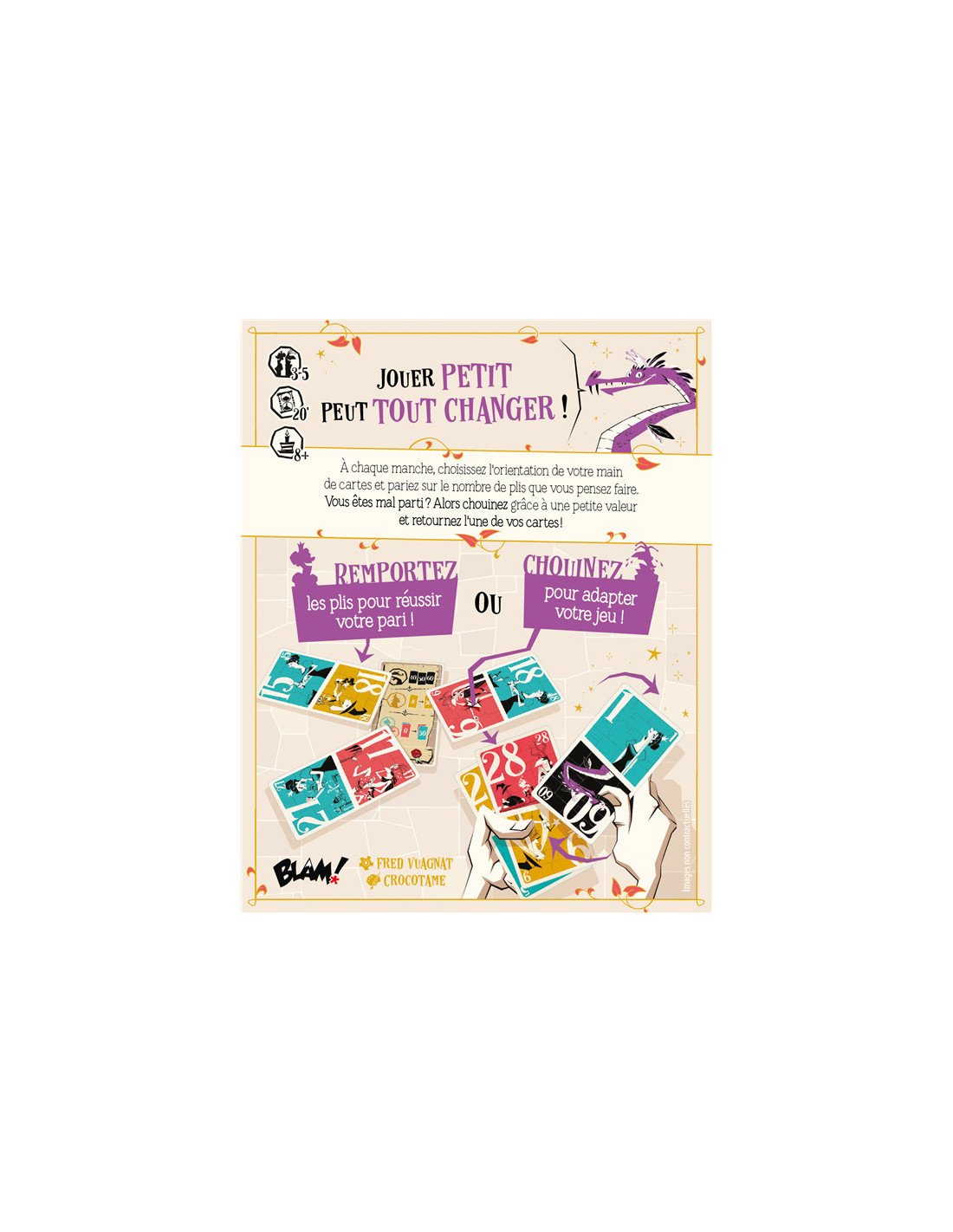 BLAM!Chouineurs est un jeu de cartes palpitant pour 3 à 5 joueurs, mêlant stratégie et bluff, idéal pour des parties rapides de 20 minutes.