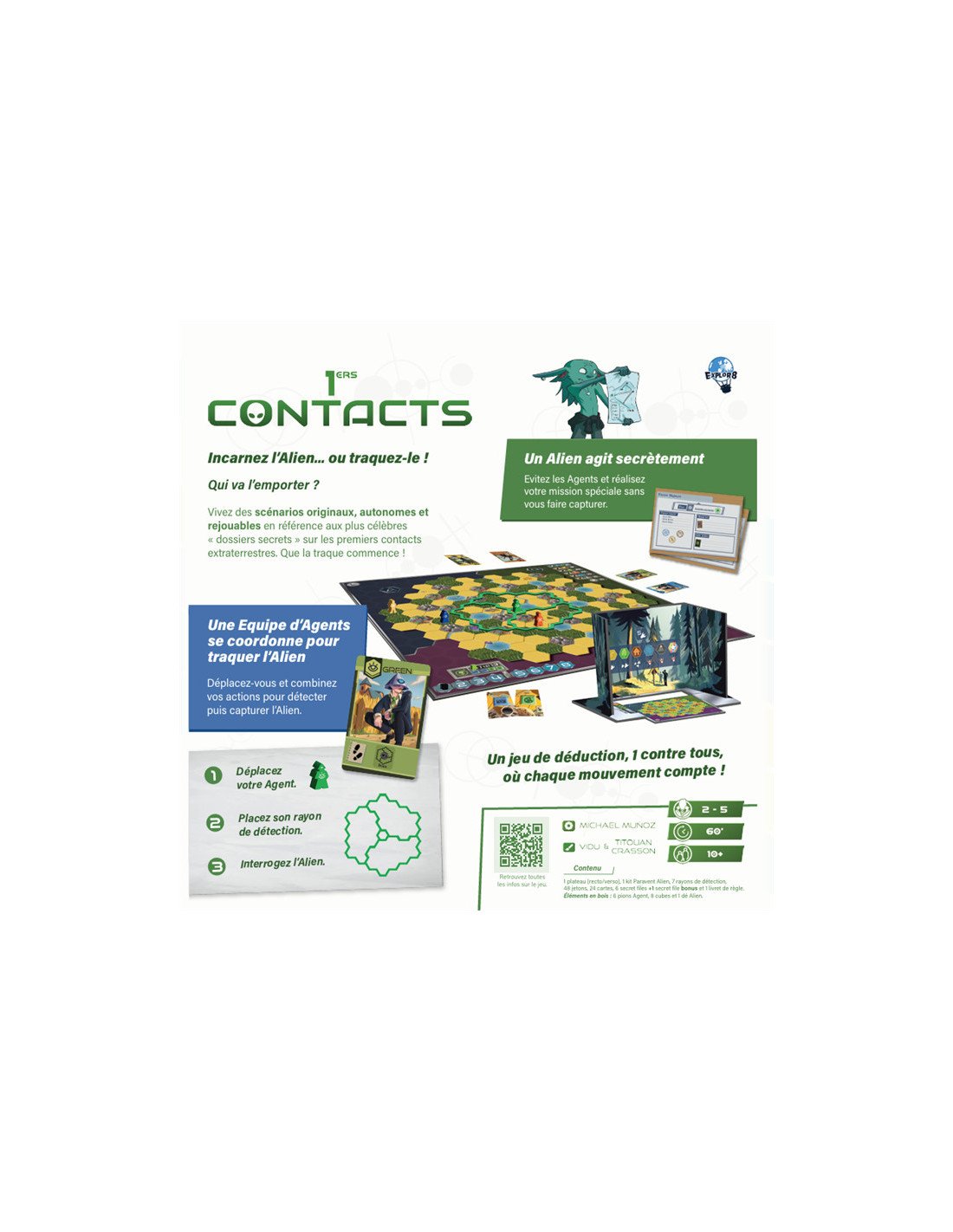 1ers Contacts est un jeu de course‑poursuite et de déduction pour 2 à 5 joueurs. Incarnez l'Alien ou traquez‑le dans une aventure où stratégie et intuition sont essentielles. Ce jeu captivant vous plonge dans une dynamique de traque entre un Alien solitaire et une équipe d'agents d’élite déterminés à l’attraper. Préparez-vous à des moments de tension et de réflexion, où chaque décision peut faire la différence entre la victoire et la défaite.