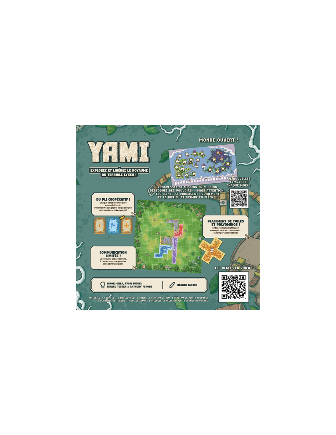 Plongez dans l'univers de Yami, un jeu de plis coopératif à communication limitée qui vous invite à explorer un monde ouvert fascinant. Avec 22 missions indépendantes à réaliser, chaque partie vous promet une expérience unique et engageante. Réunissez vos amis ou votre famille et préparez-vous à relever des défis ensemble, tout en utilisant des polyominos pour optimiser votre stratégie.