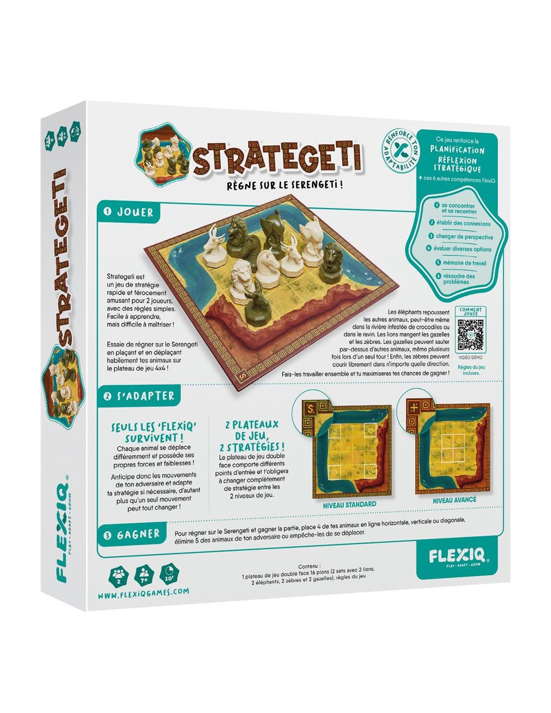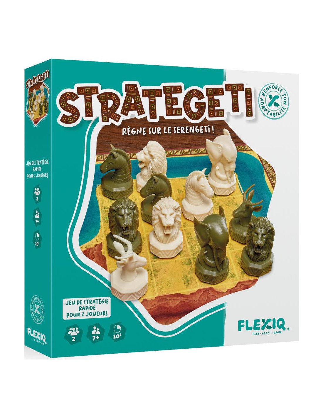 FlexiQStrategeti est un jeu de stratégie pour 2 joueurs, où vous devez déplacer vos animaux pour dominer la savane en 10 minutes. À partir de 7 ans.