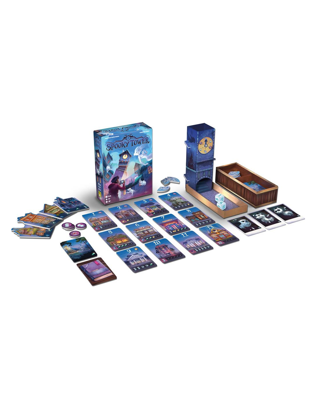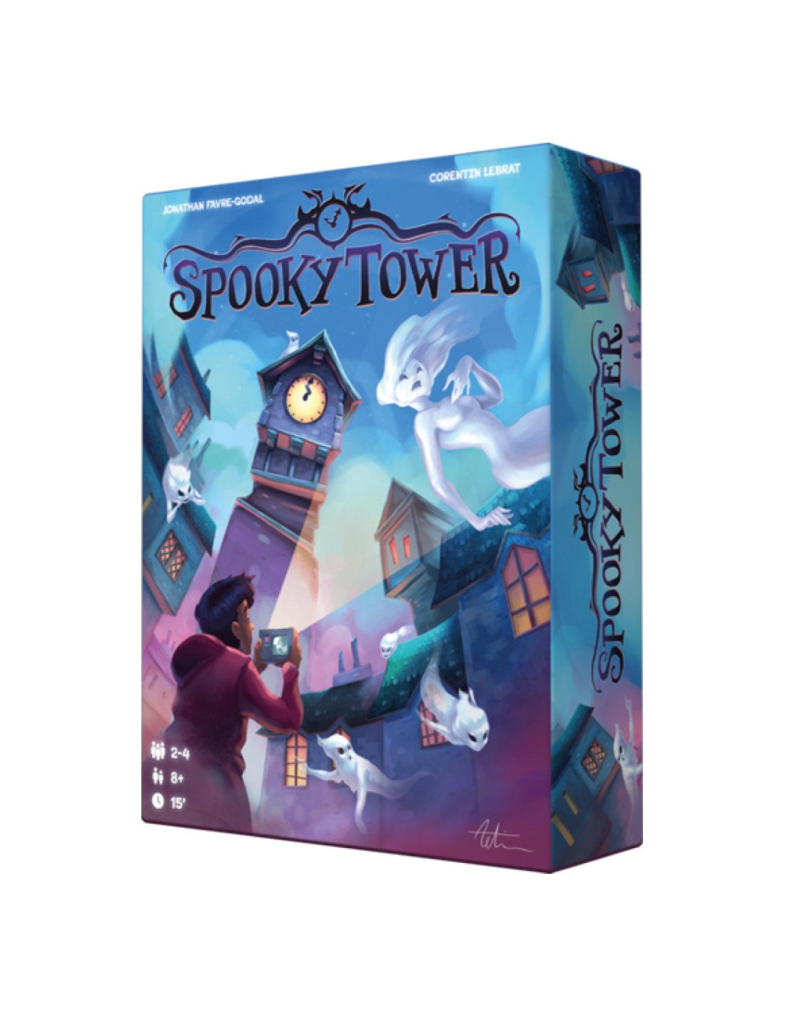 Explorez une ville hantée et capturez des fantômes dans Spooky Tower, un jeu de dés et de cartes pour 2 à 5 joueurs à partir de 8 ans.