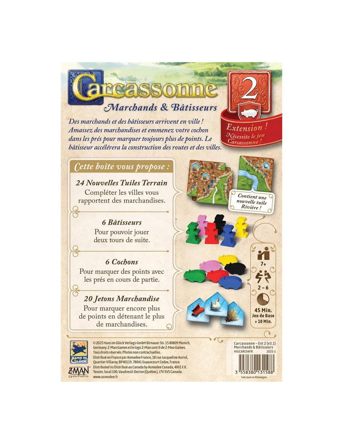 Avec cette seconde extension de Carcassonne, enrichissez vos parties grâce à de nouveaux éléments qui offrent encore plus de stratégie. Les bâtisseurs vous permettent d’enchaîner deux tours consécutifs, accélérant ainsi vos constructions. Les cochons bonifient vos champs pour gagner davantage de points, et les jetons de marchandises récompensent les joueurs les plus opportunistes sur les villes complétées. En prime, un sac en tissu est inclus pour ranger et piocher les tuiles facilement.