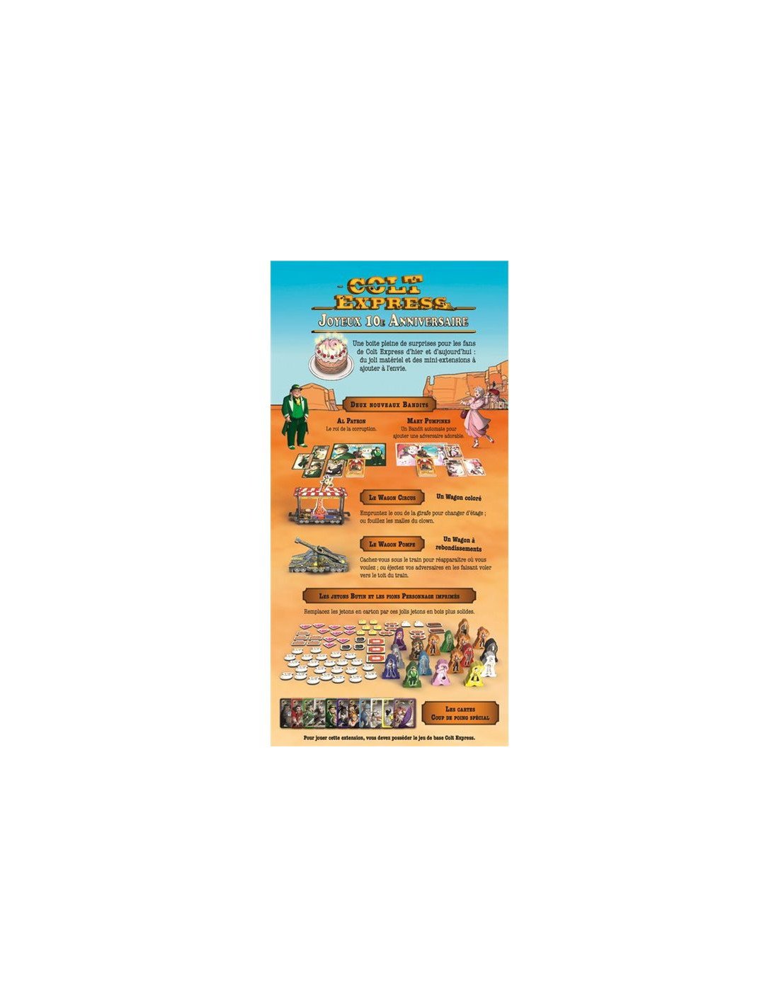 Colt Express - Joyeux 10e Anniversaire est une boîte pleine de surprises pour les fans de Colt Express d’hier et d’aujourd’hui. Cette édition spéciale offre un joli matériel et des mini-extensions à ajouter à l’envie, rendant chaque partie unique et excitante. Que vous soyez un vétéran du jeu ou un nouveau venu, cette version anniversaire saura ravir tous les amateurs de jeux de société.