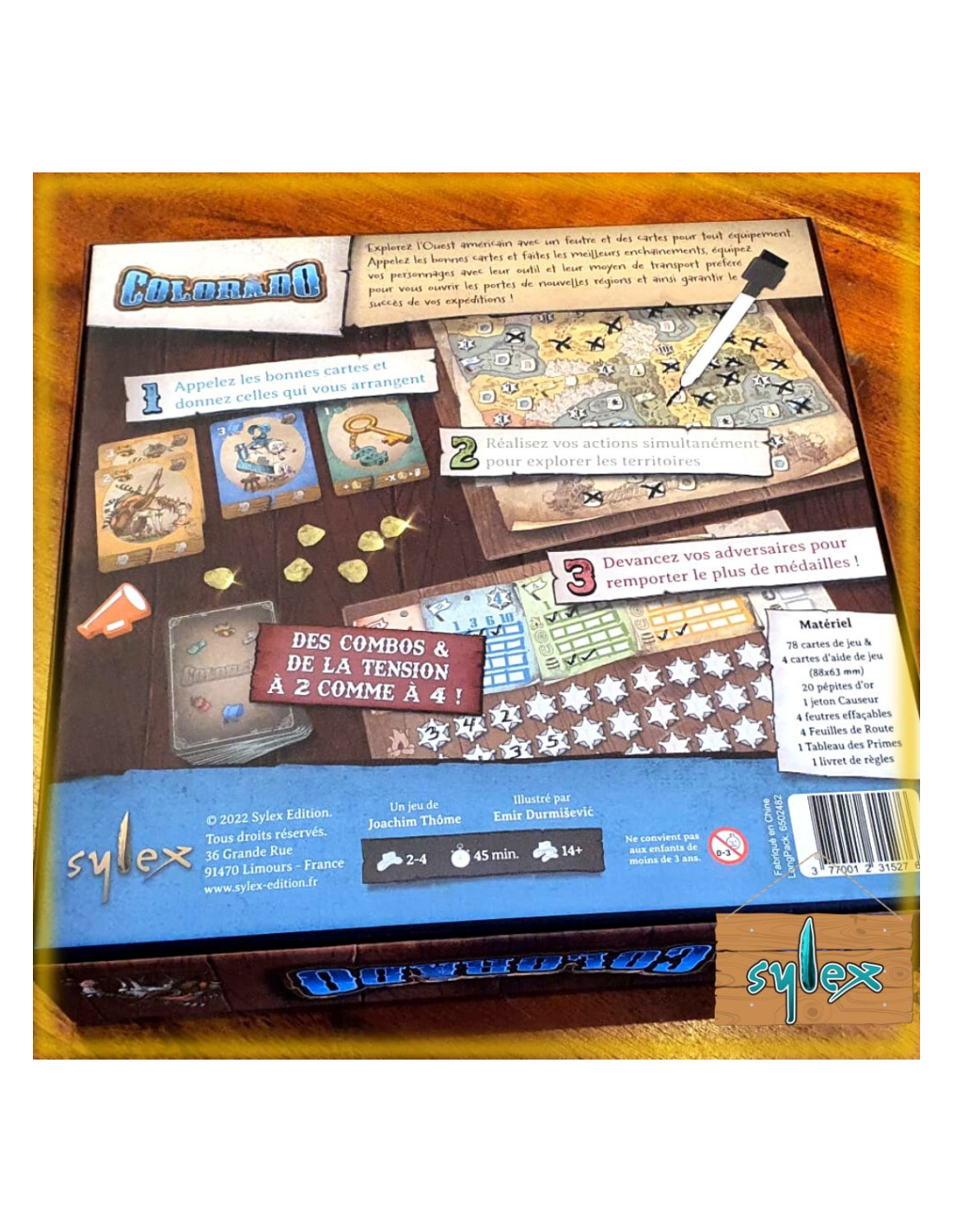 Bienvenue dans l’Ouest sauvage avec Colorado, un jeu innovant qui revisite les mécaniques classiques des jeux « & Write » avec une toute nouvelle approche : le Call & Write. Armé d’un feutre et de vos cartes, vous devrez appeler les bonnes actions, combiner vos choix et enchaîner vos coups pour explorer toujours plus loin. Vos personnages pourront s’équiper d’outils et de moyens de transport qui ouvriront l’accès à de nouvelles régions et garantiront le succès de vos expéditions.