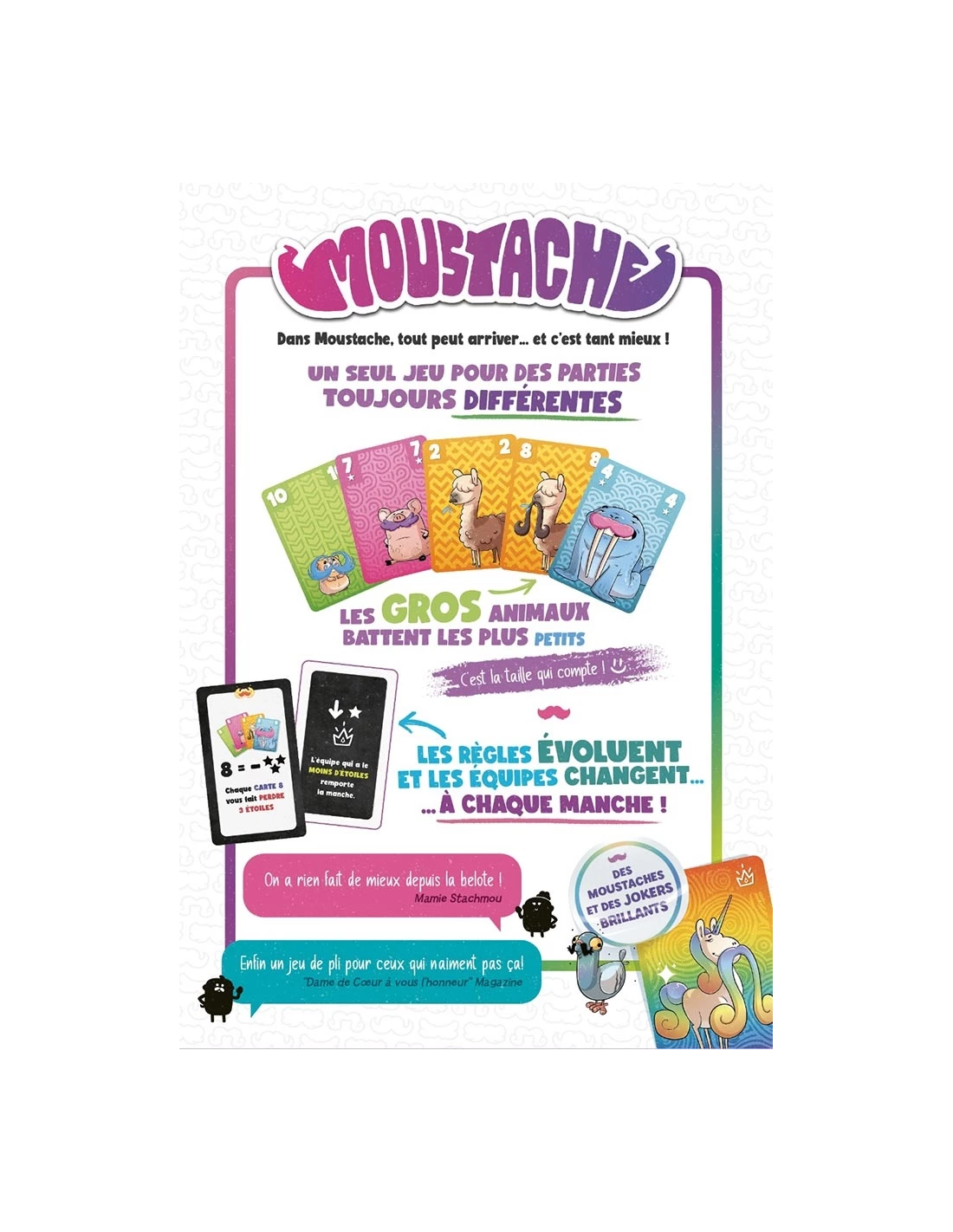 Oubliez tout ce que vous pensiez savoir sur les jeux de plis. Avec Moustache, rien n’est jamais acquis : à chaque manche, les équipes changent et une nouvelle règle vient bouleverser la partie. Une hiérarchie inversée des couleurs, des jokers loufoques, des effets de cartes imprévisibles… tout peut arriver, et c’est bien ça qui fait le sel de ce jeu.
