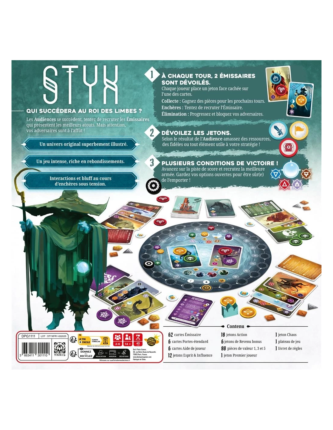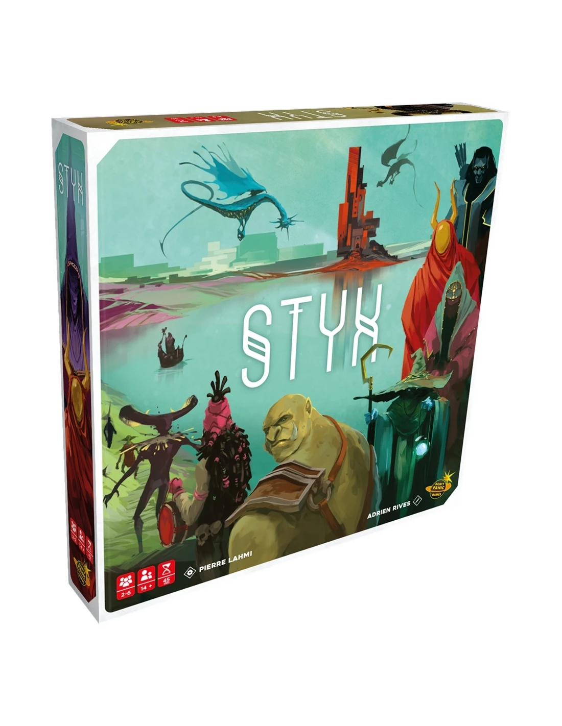 Plusieurs conditions de victoire s’offrent à vous : gravir la piste d’Influence, réunir les Éléments, contrôler les Cavaliers de l’Apocalypse, ou dominer quand le Chaos atteint son paroxysme. Avec ses enchères tendues, ses choix secrets et ses multiples chemins vers la victoire, Styx est un jeu à la fois stratégique et imprévisible, où bluff et lecture de l’adversaire sont essentiels.