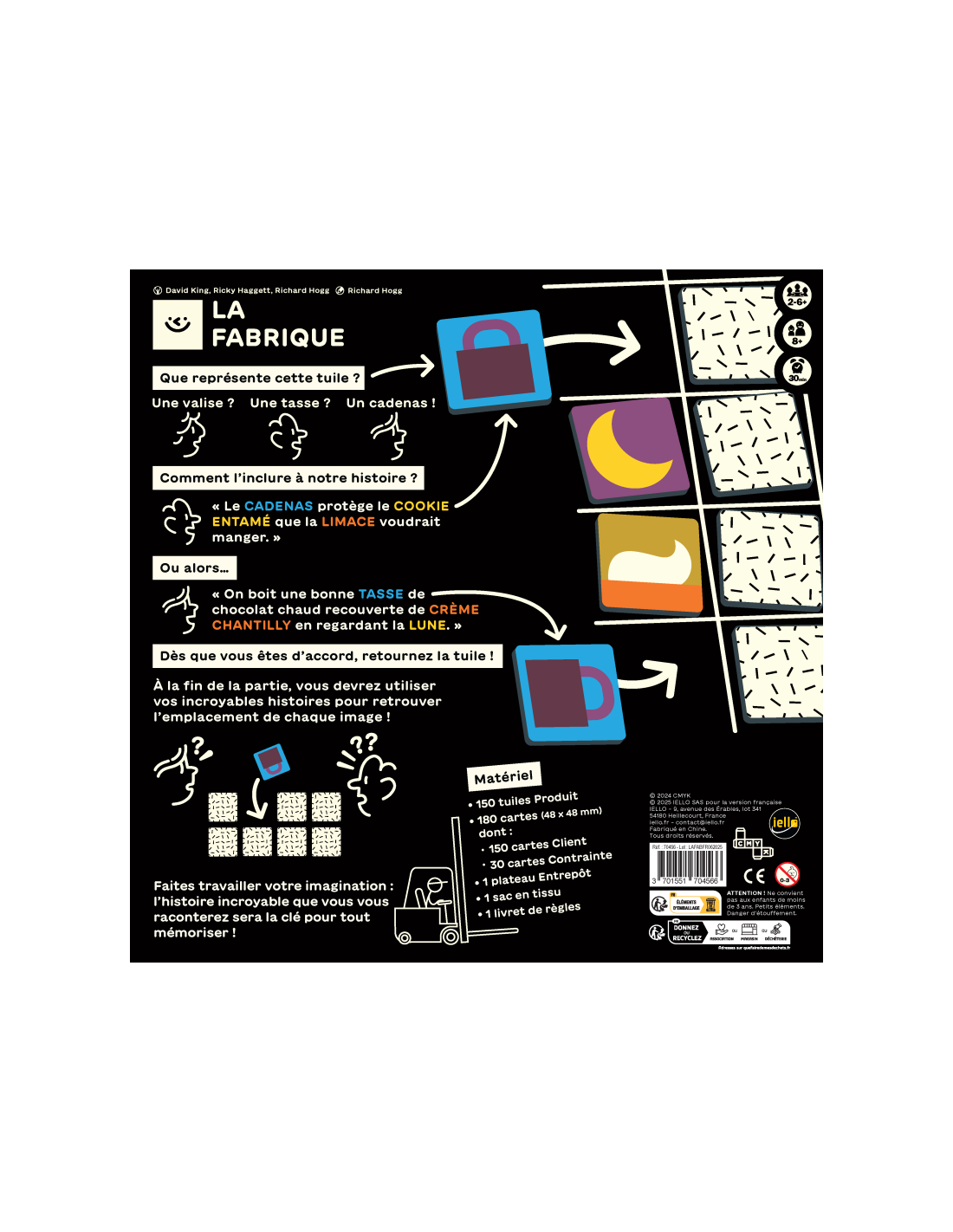 Dans La Fabrique, votre mission est de créer ensemble une histoire pleine d’imagination, puis de la reconstituer de mémoire ! À chaque tour, une tuile illustrée est révélée : les joueurs décident ensemble comment intégrer son image à leur récit collectif.