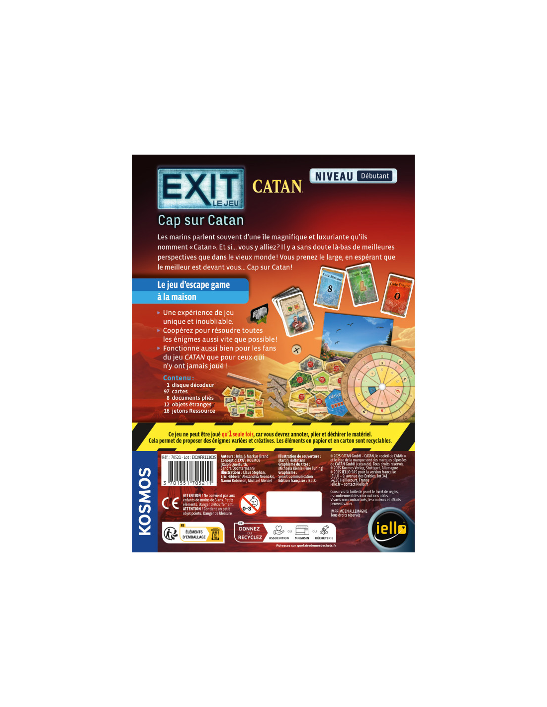Bienvenue sur l’île de Catan, mais cette fois, ce ne sont pas des colonies que vous allez bâtir… c’est votre survie que vous allez devoir assurer ! Dans Exit : Cap sur Catan, les célèbres créateurs Inka et Markus Brand fusionnent deux mondes cultes : la stratégie et l’énigme.