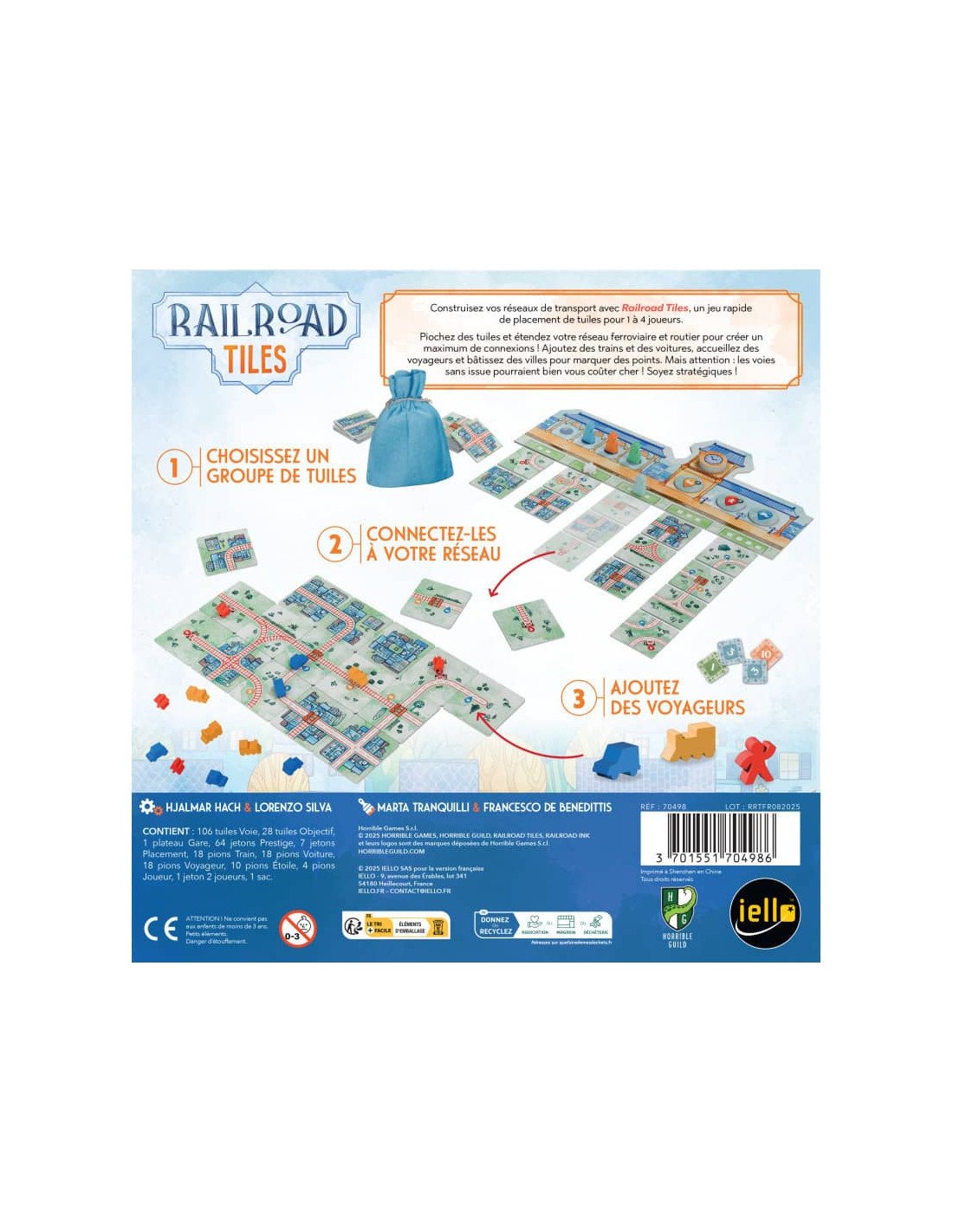 Dans Railroad Tiles, les joueurs vont tour à tour choisir des tuiles dans un marché et les placer dans leur zone personnelle afin de bâtir un réseau de rails et de routes, connecter des villes, et répondre à des objectifs spécifiques. Chaque tuile peut proposer différents tronçons de route ou de fer, et le placement stratégique de ces tuiles génère des connexions, des voyageurs, des trains, et permet d’activer des objectifs de fin de partie. Le jeu s’inscrit comme une déclinaison accessible de la série de roll-and-write Railroad Ink, mais ici totalement orientée vers la pose de tuiles et la construction visuelle de réseau. .Le matériel est minimaliste mais malin, ce qui en fait un excellent jeu pour initiation ou pour compléter un catalogue boutique avec un titre à la fois simple et élégant.