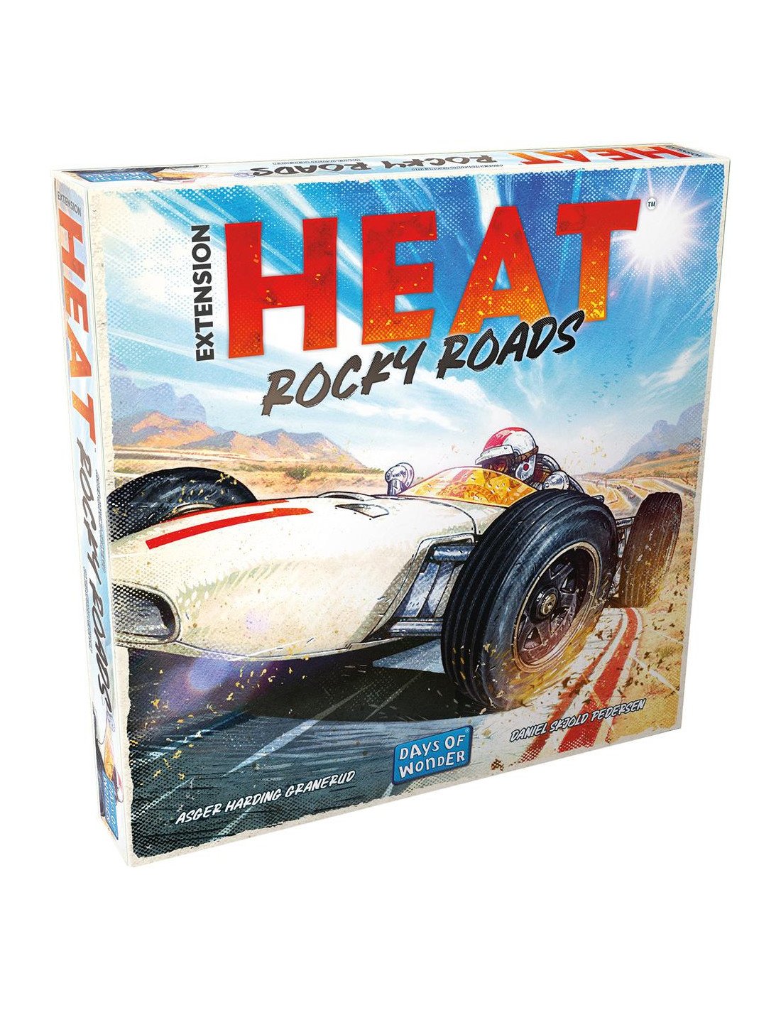 Vos pneus projettent des graviers dans toutes les directions et votre bolide commence à chasser, à la limite du tête-à-queue ! Embrayage, changement de vitesse, accélération… votre moteur rugit et vous parvenez à remettre votre voiture dans l’axe. Vous êtes toujours dans la course, mais il faudra faire plus attention à ces graviers sur la piste… Dans cette extension pour le jeu Heat, testez les pistes de gravier et les virages serrés d’Afrique du Sud, ou encore les chicanes redoutables du circuit allemand. Chaque virage est un piège. Chaque ligne droite, une opportunité de doubler. L'extension Rocky Roads présente deux nouveaux circuits. Lors du Grand Prix d’Afrique du Sud, vous serez confrontés à la présence de graviers sur la piste, qui vous demanderont contrôle et nerfs d’acier. La victoire sur le Grand Prix d’Allemagne dépendra de votre gestion des chicanes qui viennent d’être construites dans la longue ligne droite. Gérez votre moteur, adaptez votre stratégie, profitez de nouvelles sensations !