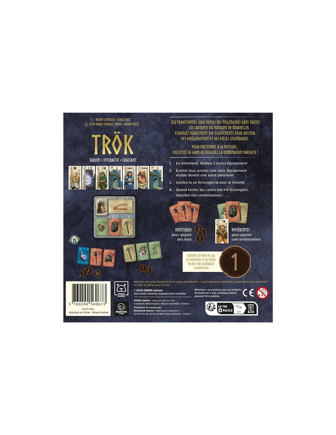 Plongez dans l'univers fascinant de Trok, un jeu captivant qui vous transporte au cœur du royaume nain de Nidavellir. Dans ce jeu de collection, vous devrez faire preuve de stratégie et d'audace pour triompher. Chaque tour est rythmé par des échanges astucieux et des combinaisons d'équipements, rendant chaque partie unique et palpitante. L'objectif ? Accumuler 50 Aare ou réaliser la combinaison parfaite pour remporter la victoire.