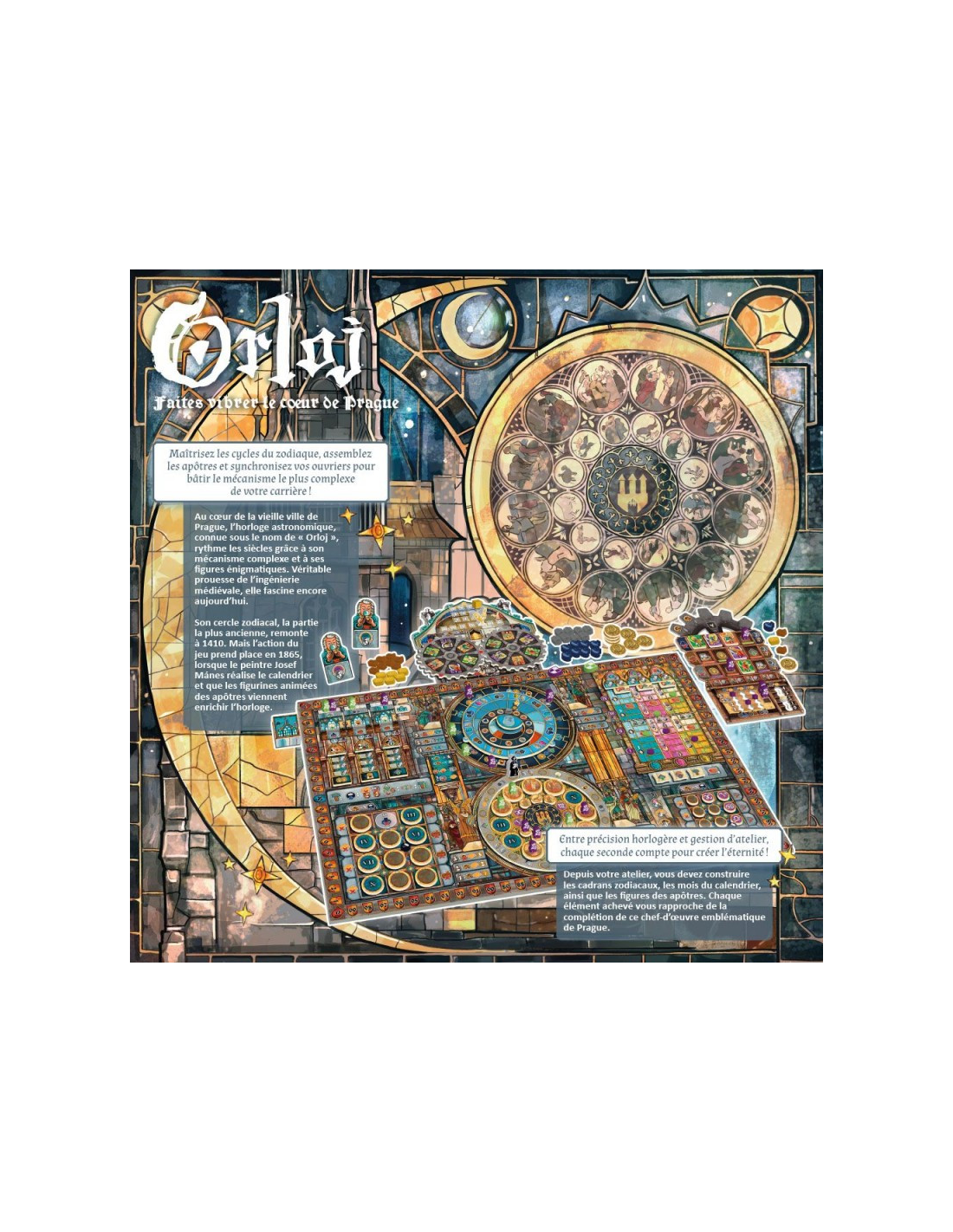Au cœur de la Vieille Ville de Prague, l'horloge astronomique antique, l'Orloj, marque le passage du temps grâce à son mécanisme complexe et ses figures énigmatiques. Dans ce jeu captivant, vous incarnez un maître bâtisseur qui s'efforce d'entrer dans l'histoire en ajoutant le calendrier légendaire et majestueux à l'Orloj. Précision, équilibre et connaissance du cosmos seront les clés de la réussite de cette tâche complexe. À chaque tour, les joueurs placent des ouvriers sur le cadran de l'horloge pour gagner des ressources et accomplir des actions afin de construire le calendrier d'Orloj.