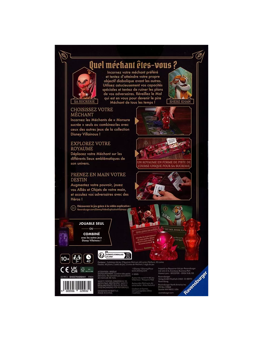 Dans Villainous : Morsure Sucrée, deux nouveaux méchants rejoignent la lutte pour la victoire. Incarnez Sa Sucrerie (Les Mondes de Ralph) ou Shere Khan (Le Livre de la Jungle), chacun avec son objectif unique et son plateau de jeu thématique. Comme toujours dans Villainous, vous devrez ruser, optimiser vos actions et exploiter vos cartes pour accomplir votre sombre dessein… avant les autres.