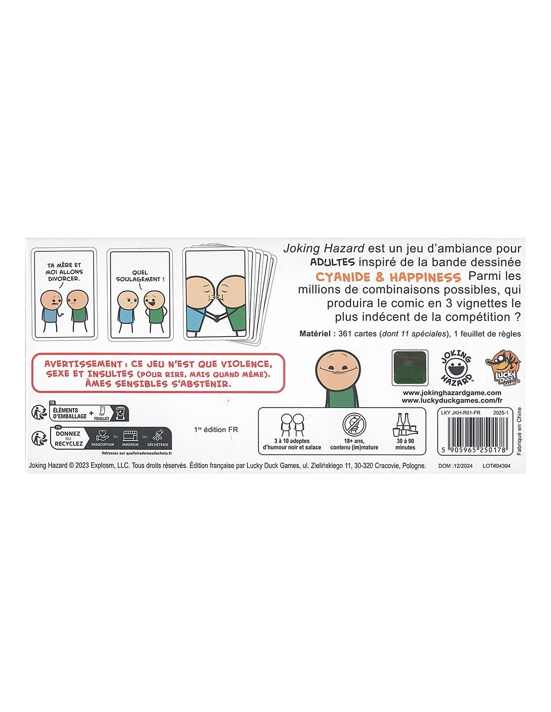 Avec plus de 360 cartes illustrées, les combinaisons possibles sont quasi infinies, garantissant des soirées explosives entre amis. Provocant, absurde et sans tabou, Joking Hazard est à réserver aux adultes qui veulent un jeu de société aussi drôle qu’impertinent.