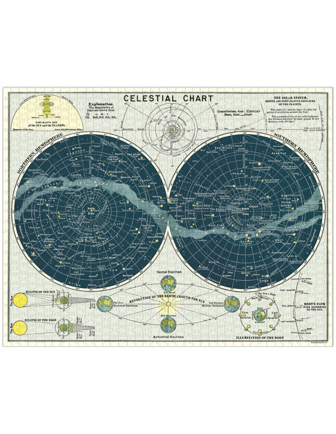 Partez à la découverte des étoiles avec le Puzzle Celestial – Cavallini – 1000 pièces. Inspiré d’une affiche vintage représentant une carte des constellations, ce puzzle vous plonge dans un voyage cosmique entre astronomie et art rétro.