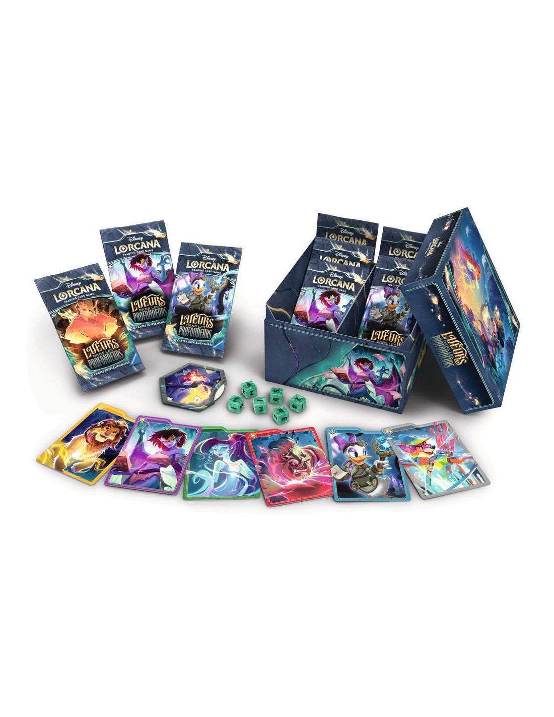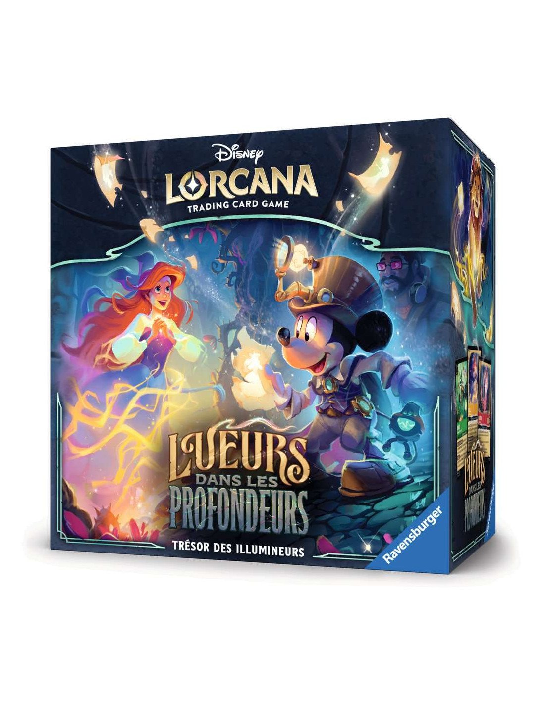 Le Trésor des Illumineurs – Lueurs des Profondeurs est le coffret parfait pour tout joueur Lorcana : 8 boosters, dés, compteur de Lore et boîte de rangement illustrée pour une expérience complète.