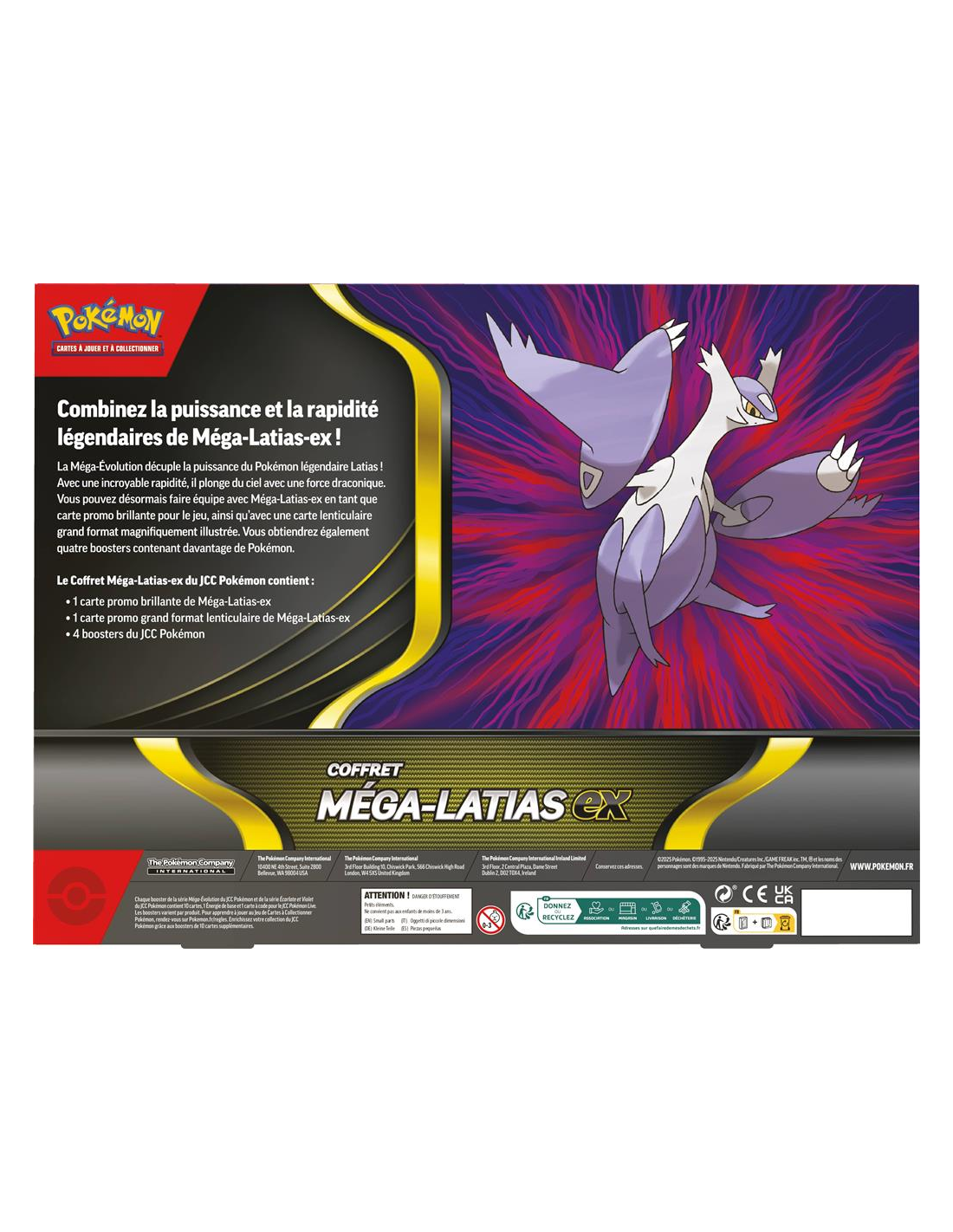 Avec une rapidité et une puissance draconique impressionnantes, Latias plonge du ciel pour rejoindre vos rangs et booster vos stratégies. Ce coffret inédit inclut une carte promo brillante de Méga-Latias-ex ainsi qu’une carte lenticulaire grand format aux illustrations spectaculaires.