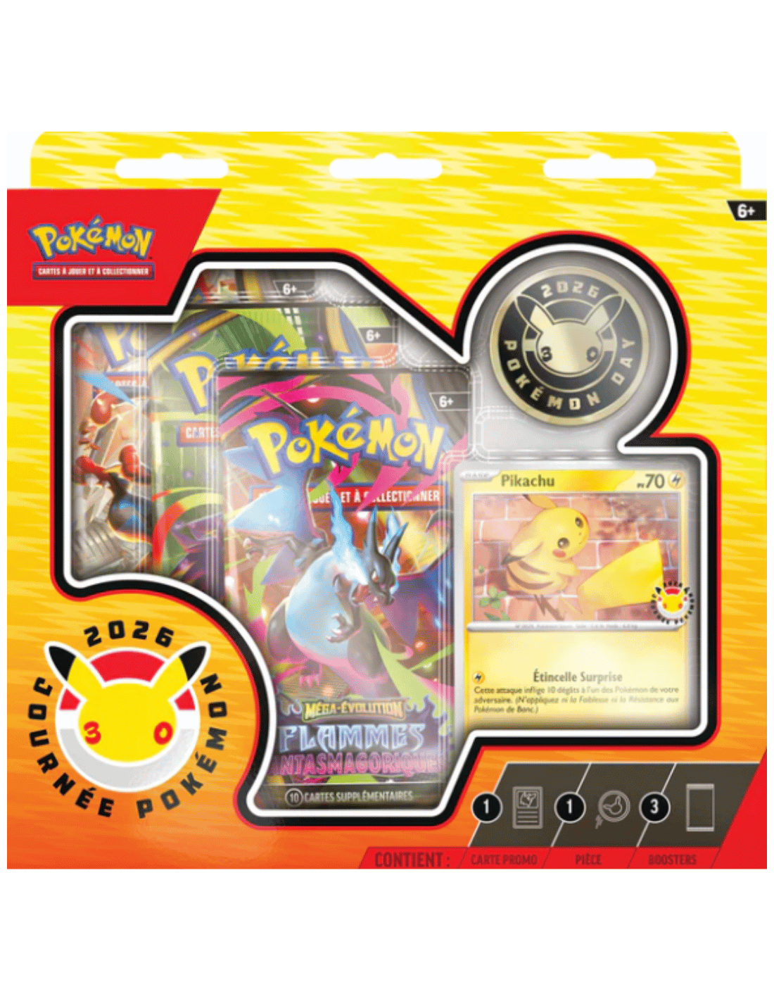 Coffret Pokémon Day 2026 – 30 ans : 3 boosters, carte promo Pikachu exclusive et pièce métallique collector pour célébrer la Journée Pokémon et le 30e anniversaire de la saga le 30 janvier 2026.