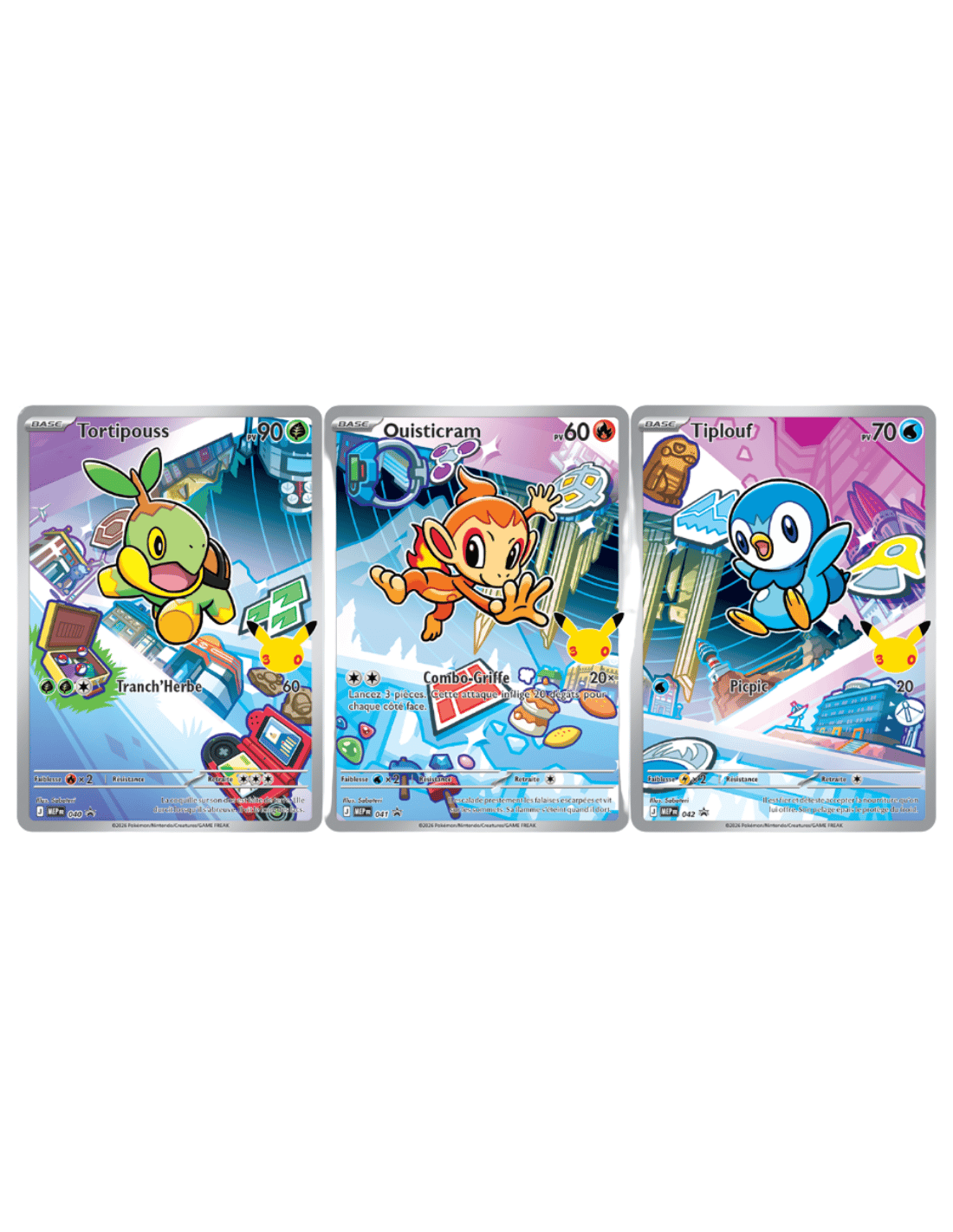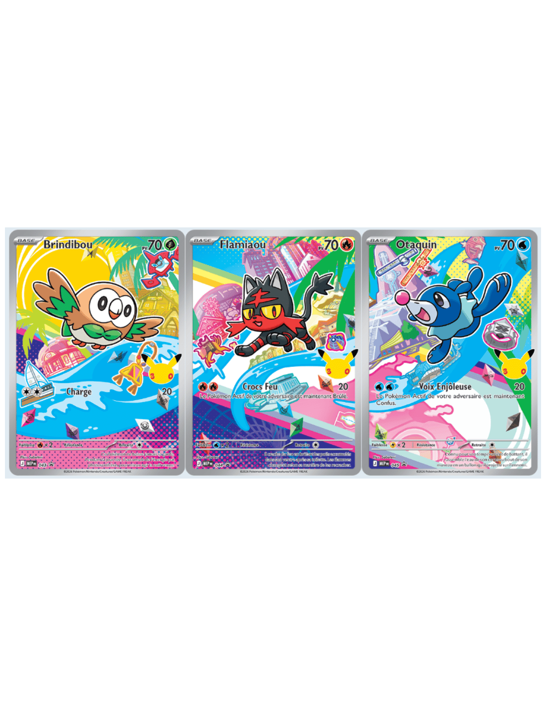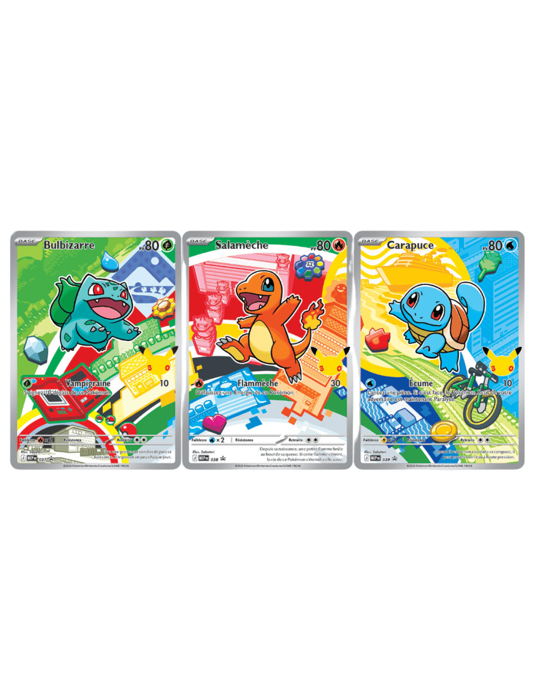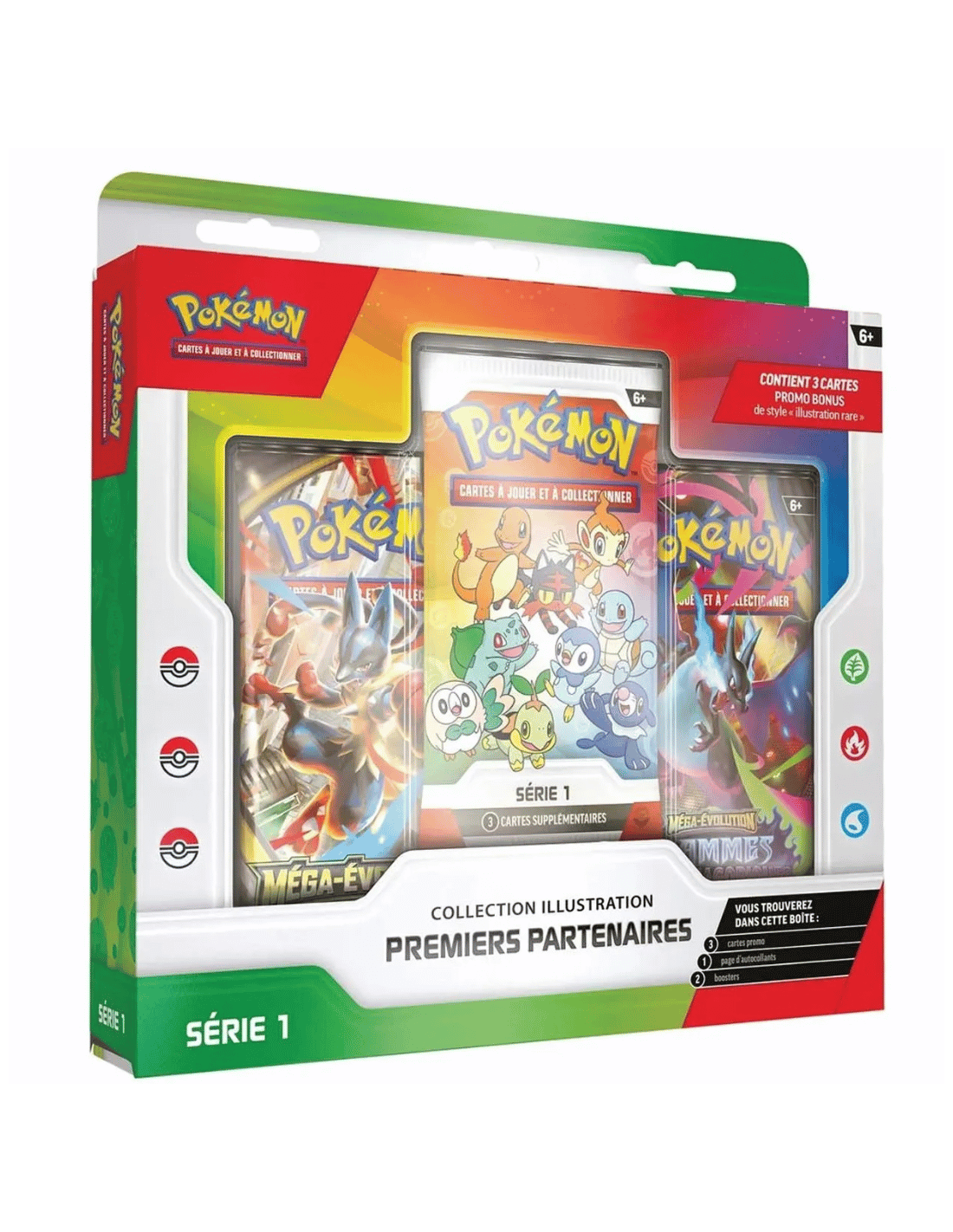 En complément, vous trouverez deux boosters supplémentaires du JCC Pokémon pour enrichir votre collection, ainsi qu’une page d’autocollants dédiée aux premiers partenaires.