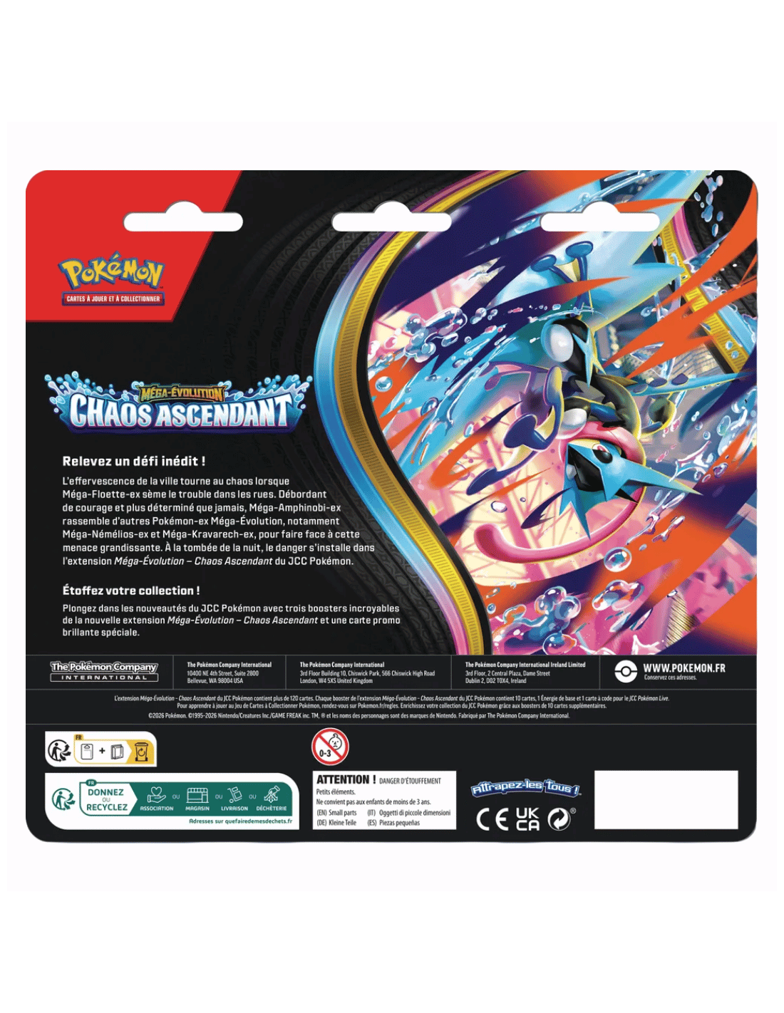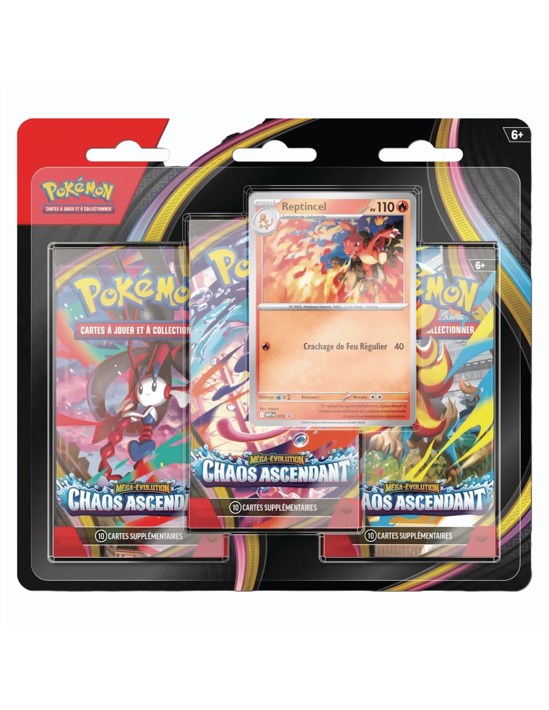 Ce coffret contient 3 boosters Chaos Ascendant, une carte promo exclusive de Reptincel ainsi qu’un jeton Pokémon, parfait pour enrichir votre collection dès la sortie.