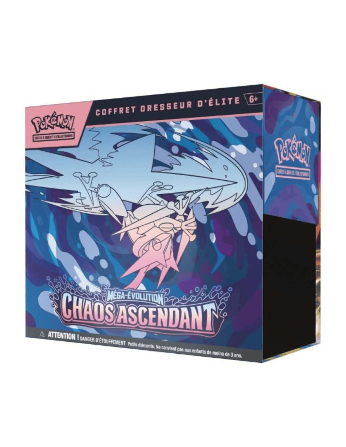 Coffret Dresseur d’Élite Pokémon ME04 : Chaos Ascendant avec 9 boosters, carte promo et accessoires complets. Idéal pour découvrir l’extension Méga-Amphinobi.