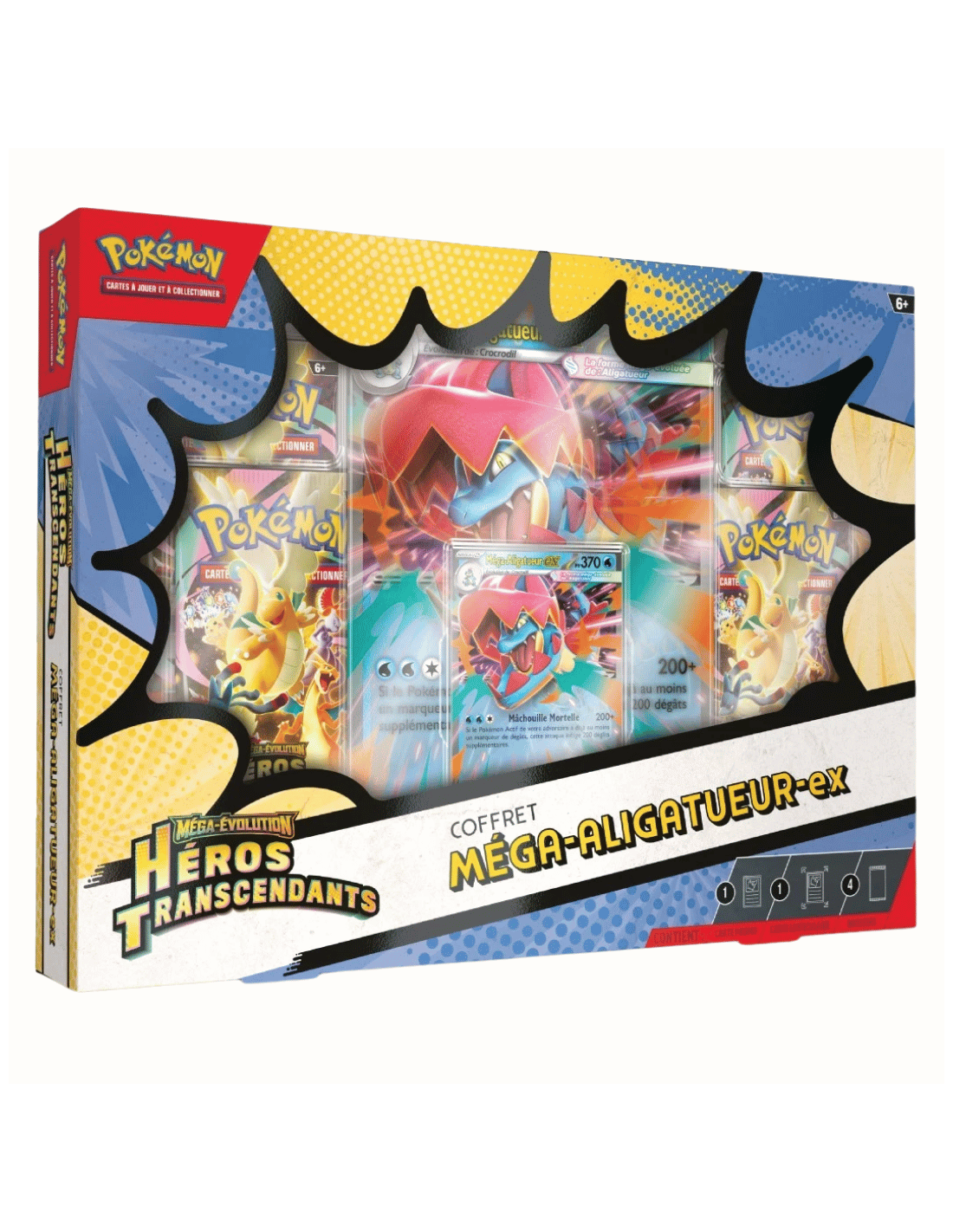 Coffret Méga-Aligatueur-ex ME2.5 : 4 boosters Héros Transcendants, carte promo brillante et carte jumbo lenticulaire. Disponible le 24 avril 2026.