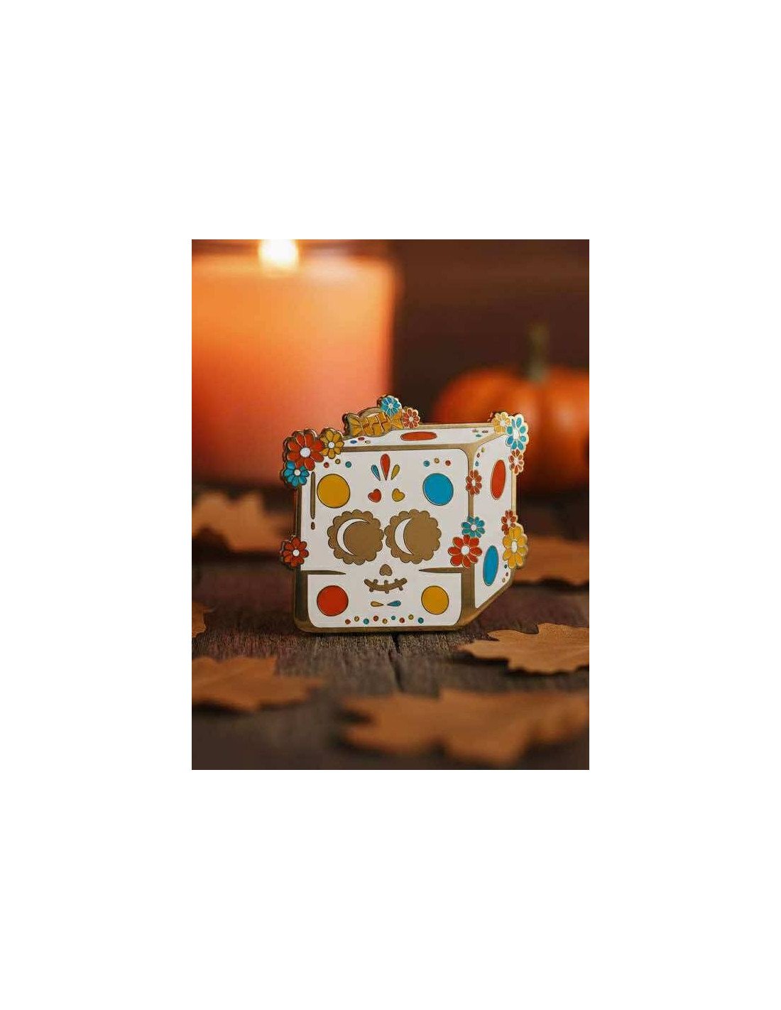 Le Pin’s Phospho – Le DéA De Los Muertos est une création originale signée Le Grenier Ludique, inspirée du Día de los Muertos mexicain. Ce petit bijou de 25x28 mm en métal émaillé phosphorescent représente un dé-squelette coloré, orné de motifs festifs et dorés.